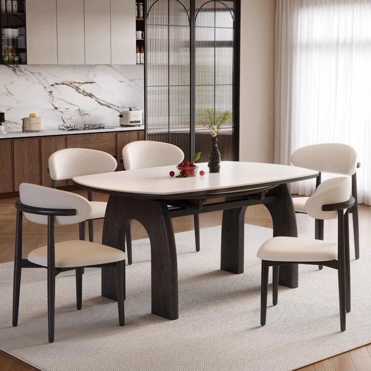 クリーム風の岩板製ダイニングテーブル|四角・丸両用、伸縮可能|小型住宅に最適なモダンミニマルデザインのアイランドテーブルと椅子セット。おしゃれで機能的な空間作りをサポートします!