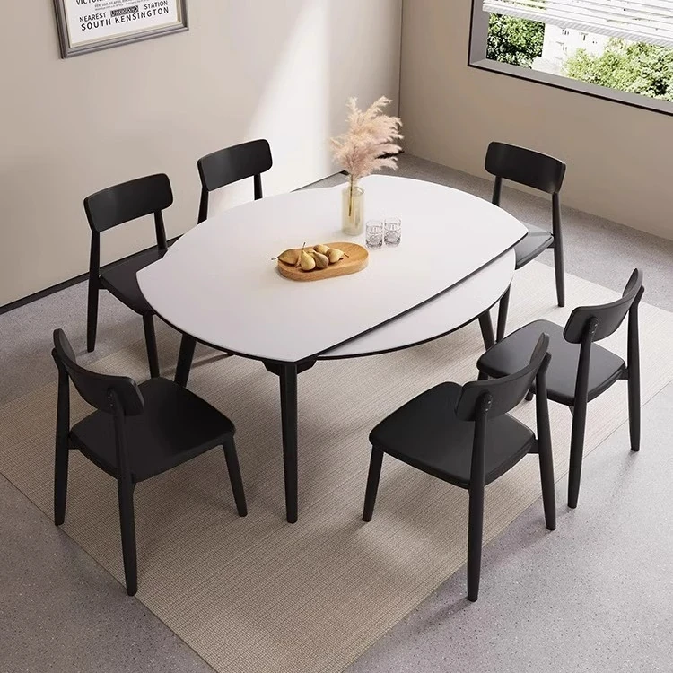 現代的軽奢スタイル、岩板製の円形・角形兼用ダイニングテーブル&チェアセット。小型住宅に最適な伸縮可能な折りたたみ式テーブルで、食事を楽しむための理想的な選択です!