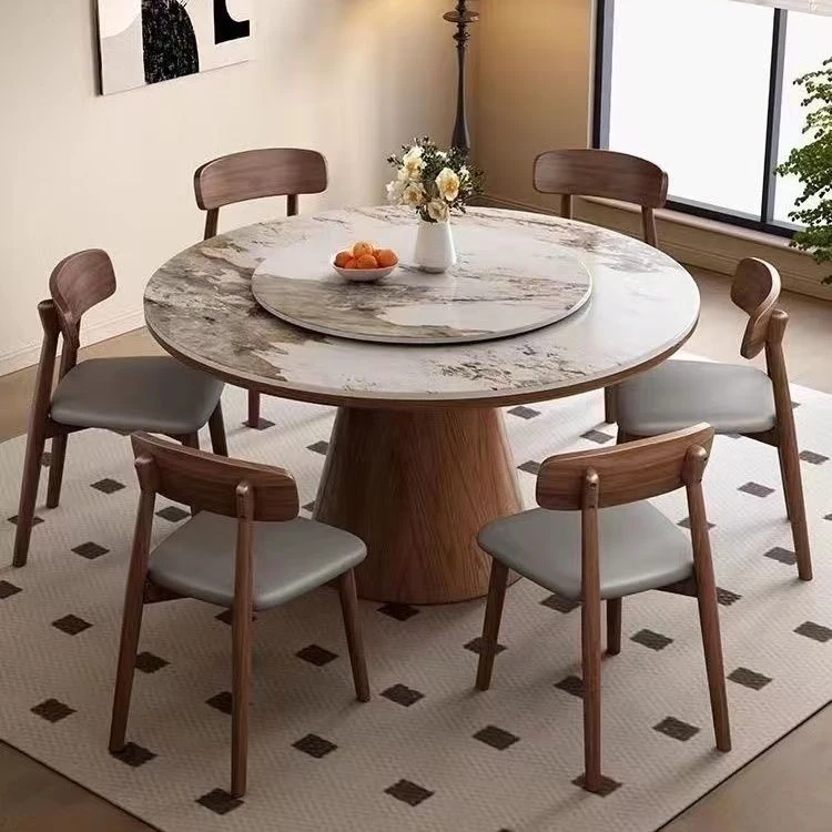 高級ストーンテーブルセット - 北欧風の円形ダイニングテーブル&チェア、回転盤付きのモダンなデザインで、シンプルな無垢材使用。おしゃれで機能的な家族の食卓に最適!