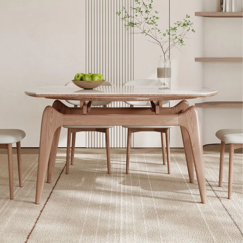 現代的でシンプルな岩板伸縮ダイニングテーブル - 家庭向け小型スペースに最適!ホワイトアッシュ材使用、四角と円形の二重機能を備えた多用途テーブルと椅子のセット。おしゃれで実用的な食卓をお楽しみください!