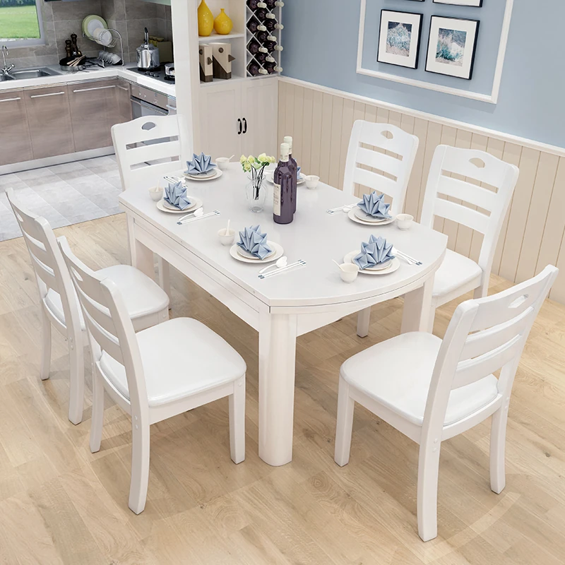 現代的シンプルな全木製ダイニングテーブルと椅子のセット。小型住宅に最適な折りたたみ式のテーブル。四角と丸の2WAYデザインで、白色のテーブルはどんなインテリアにもマッチ!おしゃれで機能的、家族の食卓にぴったりです。