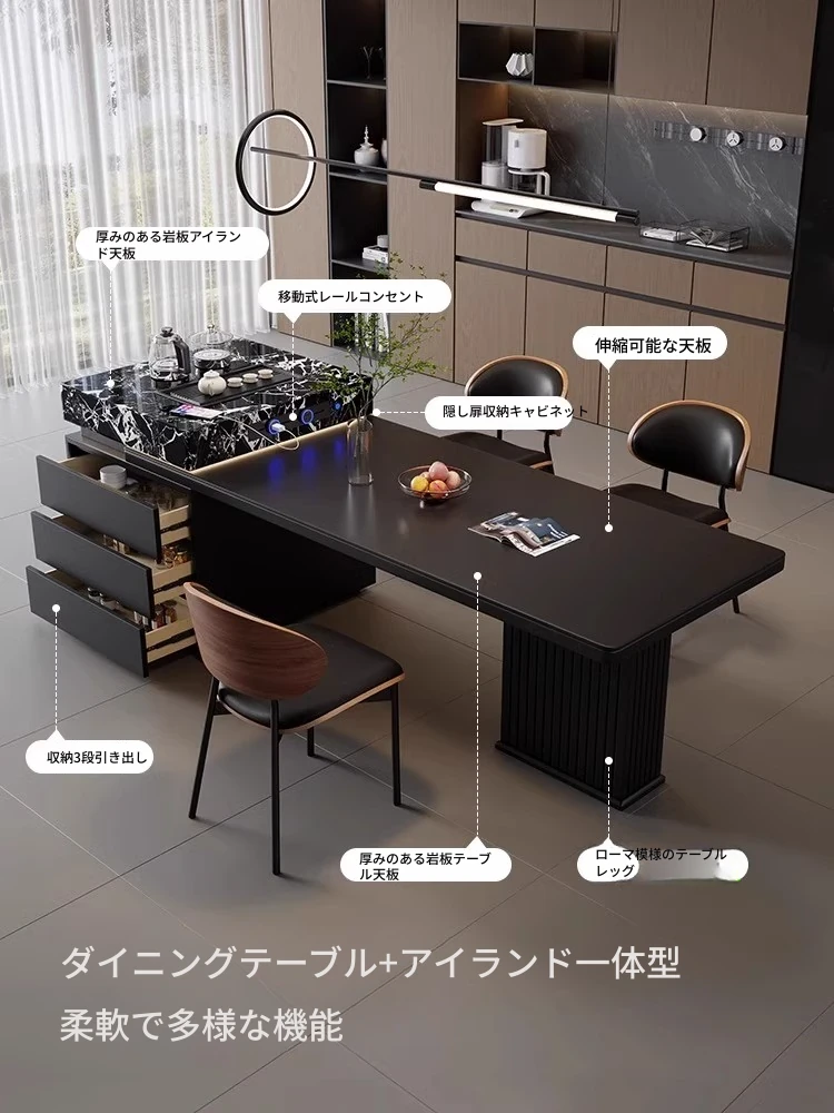 イタリアンスタイルのロックプレートアイランドダイニングテーブル - 伸縮可能で収納も完備!家庭用のバーカウンターテーブルとしても最適な軽やかさと高級感を兼ね備えたリビングダイニングテーブル。