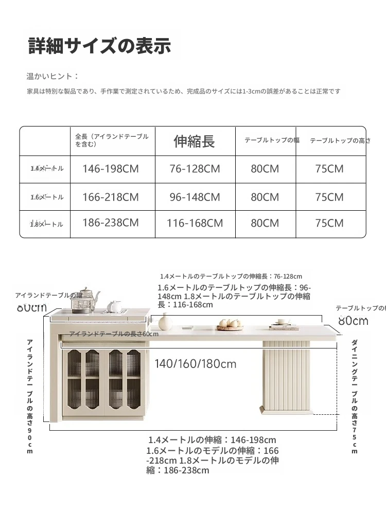 クリーミーな風合いの全木製岩板アイランドテーブル - スライド式でサイズ調整可能!小さなお部屋でも大活躍する多機能デザイン、家族の集いに最適です。