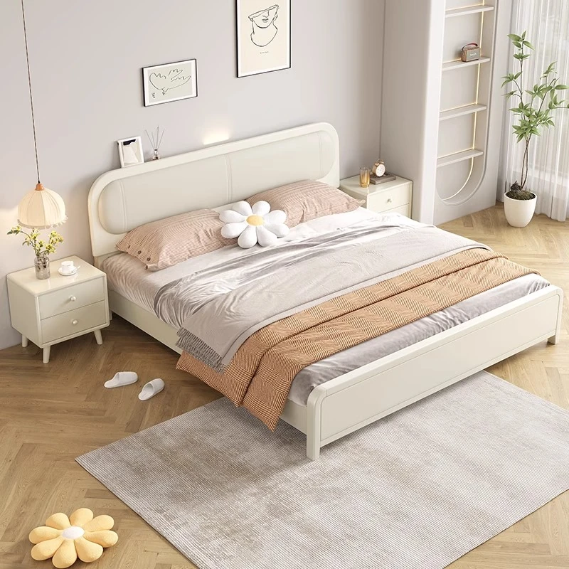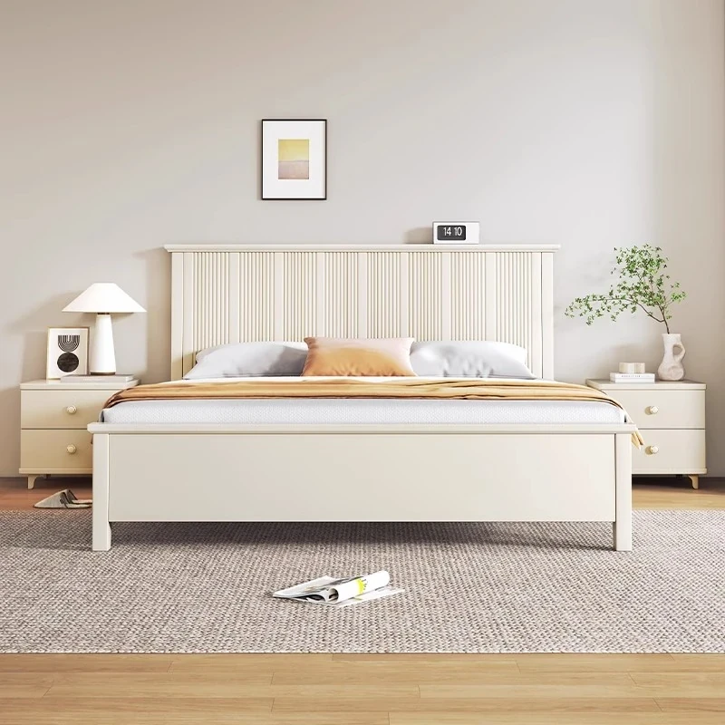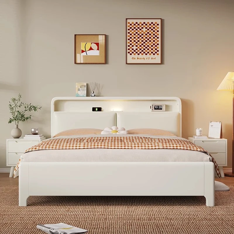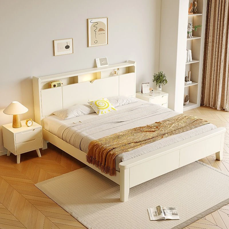 クリーム風の無垢材製モダンシンプルダブルベッド - ホワイトの主寝室用収納付き大型婚礼ベッド、小さなスペースにも最適!快適さとスタイルを兼ね備えた理想の一台。