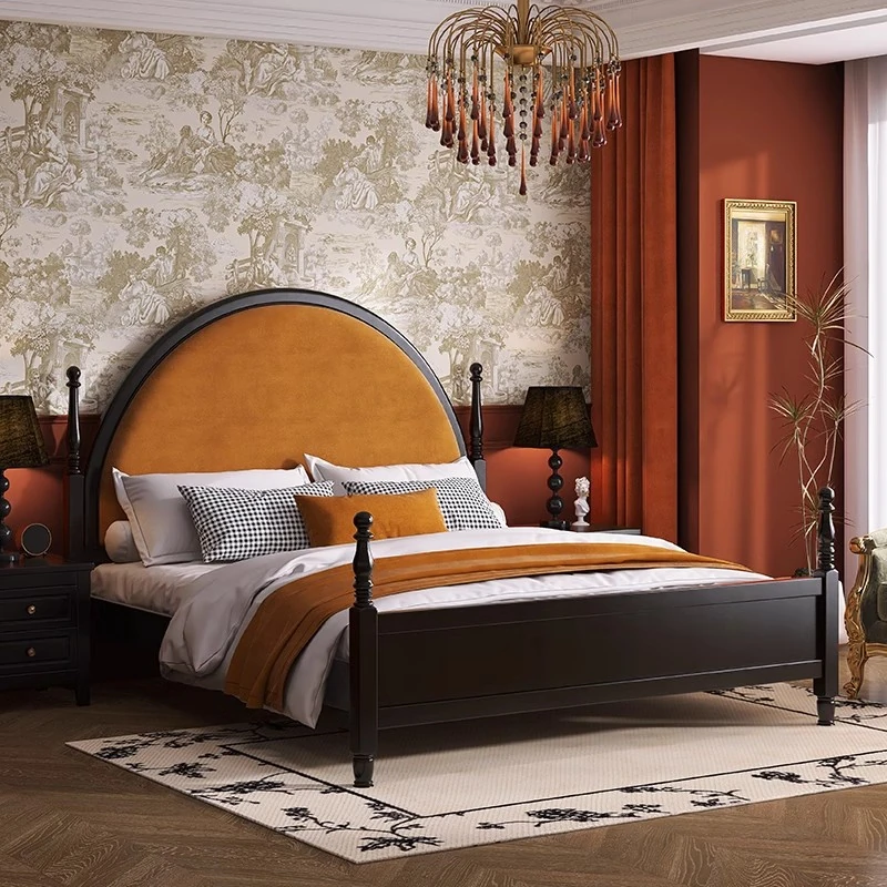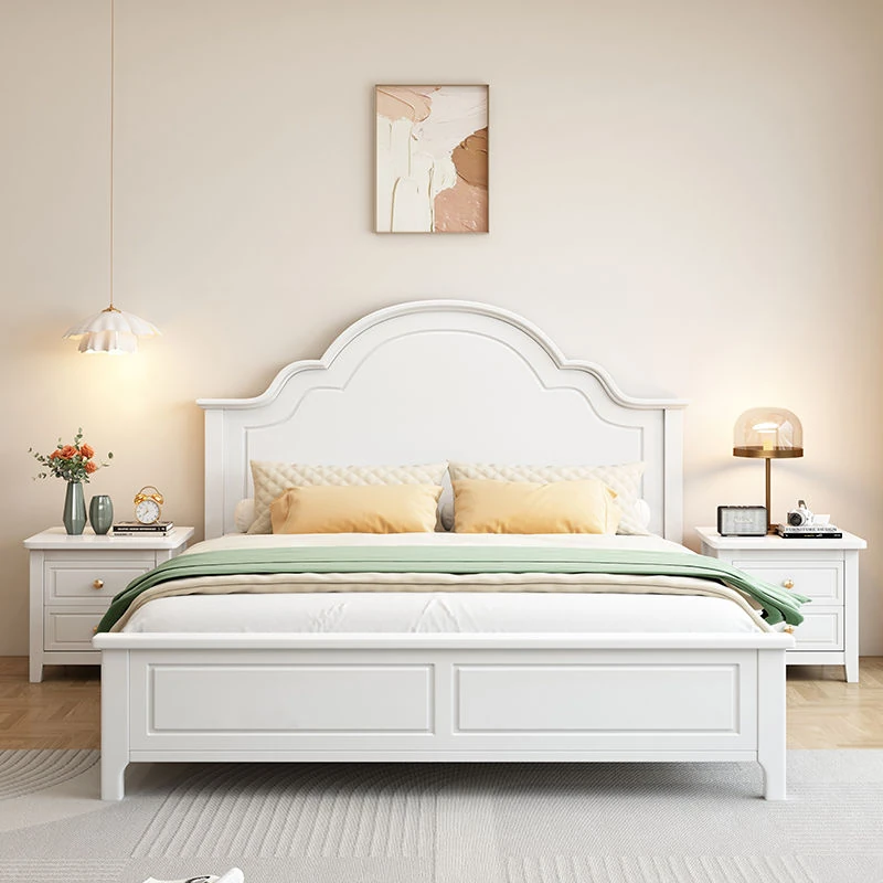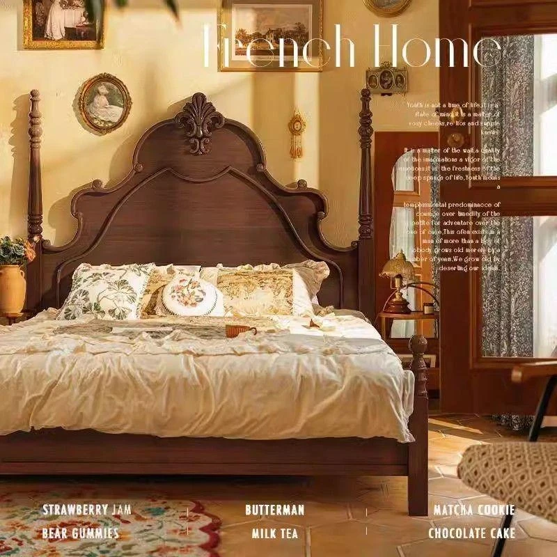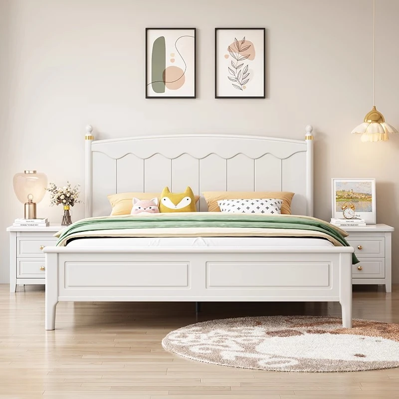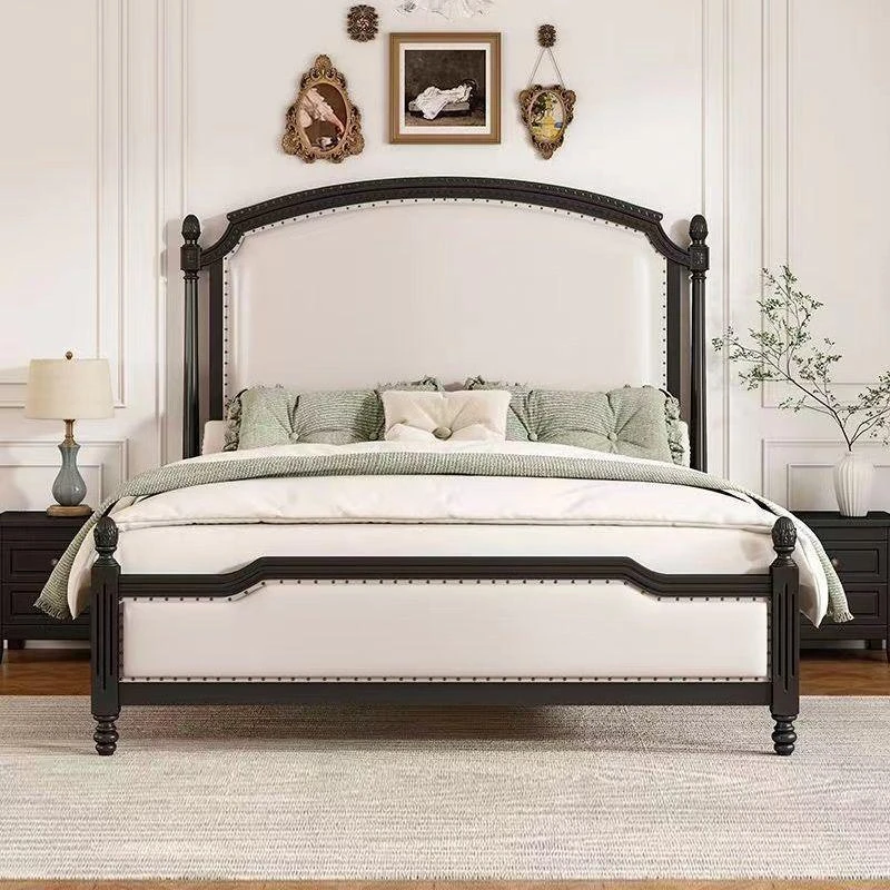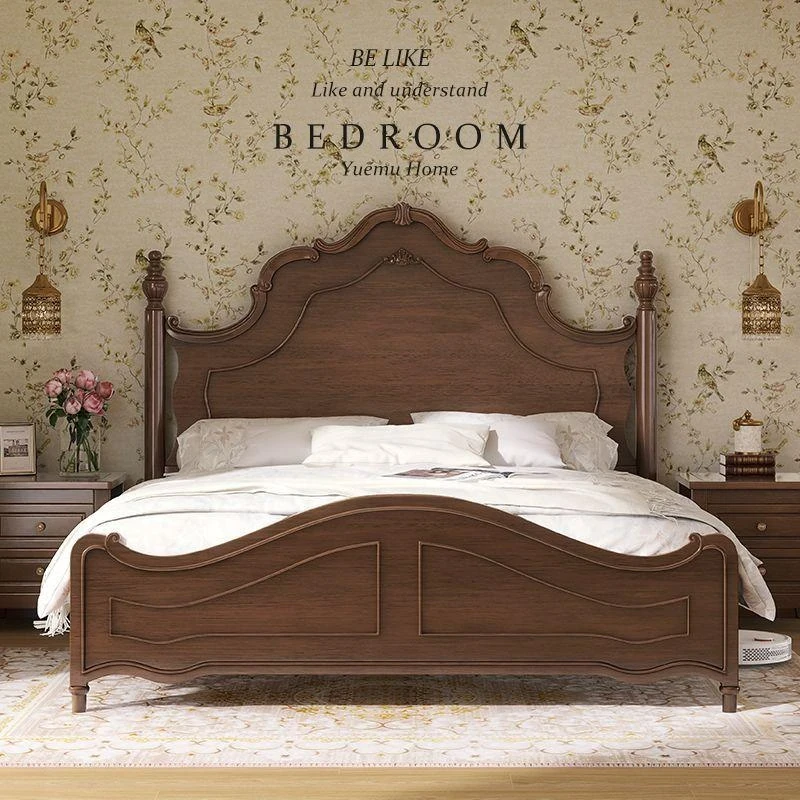 アメリカンレトロ実木ベッド - 主寝室にぴったり!1.5mウォールナット色と1.8mフレンチホワイトのダブルベッド、プリンセススタイルで優雅な空間を演出します。あなたの夢の寝室を手に入れましょう!