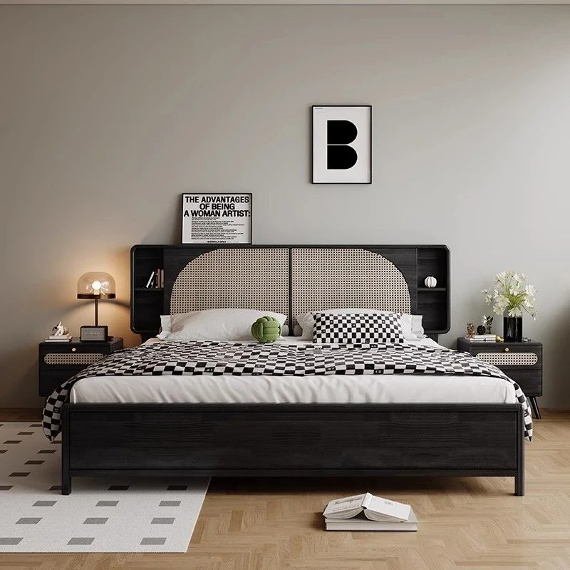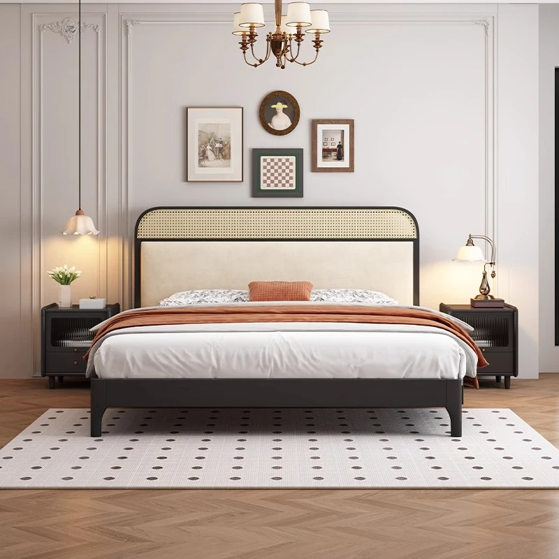 北欧スタイルの無垢材製ベッド - ミニマリスト向け1.8m大床、ブラックラタンソフトパッキング付き - 小さな寝室に最適なダブルマリッジベッド!