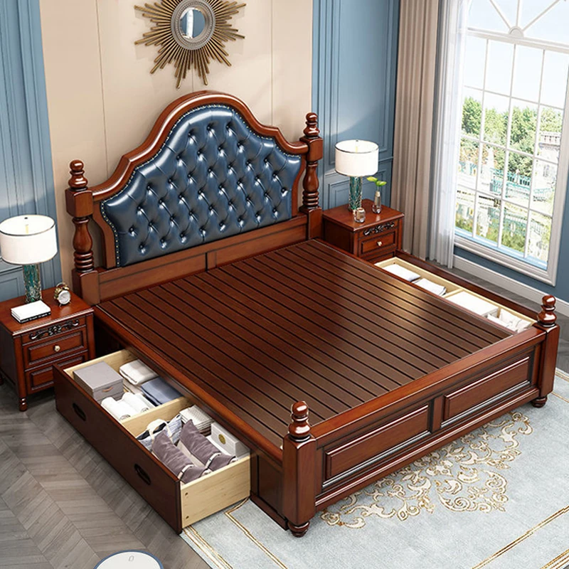 アメリカンスタイルの無垢材ダブルベッド、シンプルで美しいデザイン。1.5mと1.8mサイズから選べる、主寝室にぴったりの収納付きヴィンテージフレンチスタイルの結婚用ベッド。おしゃれで機能的な空間を演出します!