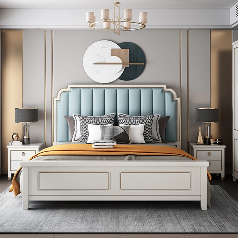レトロモダンなシンプルアメリカンスタイルの本革ヘッドボード付き、主寝室にぴったりなフレンチパリ風の軽奢華1.5M/1.8Mダブルベッド。上質な木材と洗練されたデザインで、心地よい眠りをお届けします。