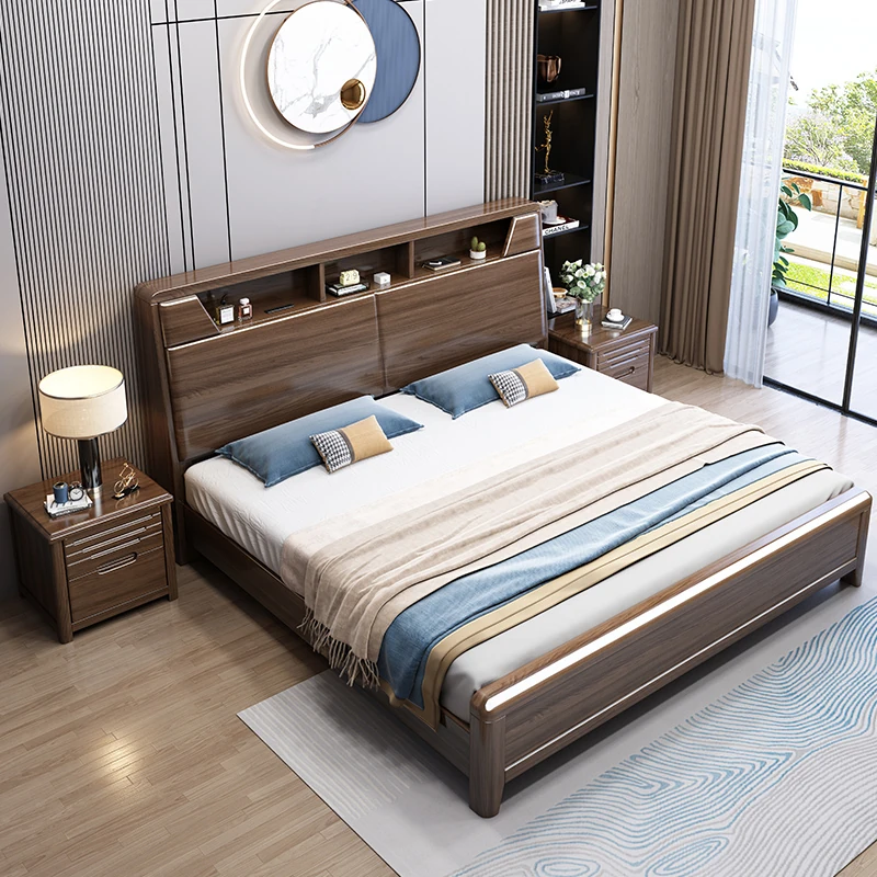 輸入品ウォールナット無垢材ベッド|現代的なシンプルデザイン|1.8m主寝室用ダブルベッド|新中式スタイル|1.5m収納付き婚礼ベッド|快適な眠りを約束する上質な一品!