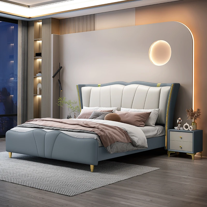 モダンな軽奢スタイルの無垢材レザー張りベッド - 家庭用主寝室に最適な高級ダブルベッド(1.8m)ナパレザーソフトパック付き収納大婚ベッドで、贅沢な眠りをお楽しみください!