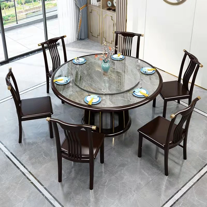 Elegant New Chinese Style Solid Wood Dining Table with Rock Plate – Perfect for 6 to 8 People, Round Design with Rotating Turntable, Ideal for Small to Medium Homes, Complete with Chairs for a Cozy Dining Experience.