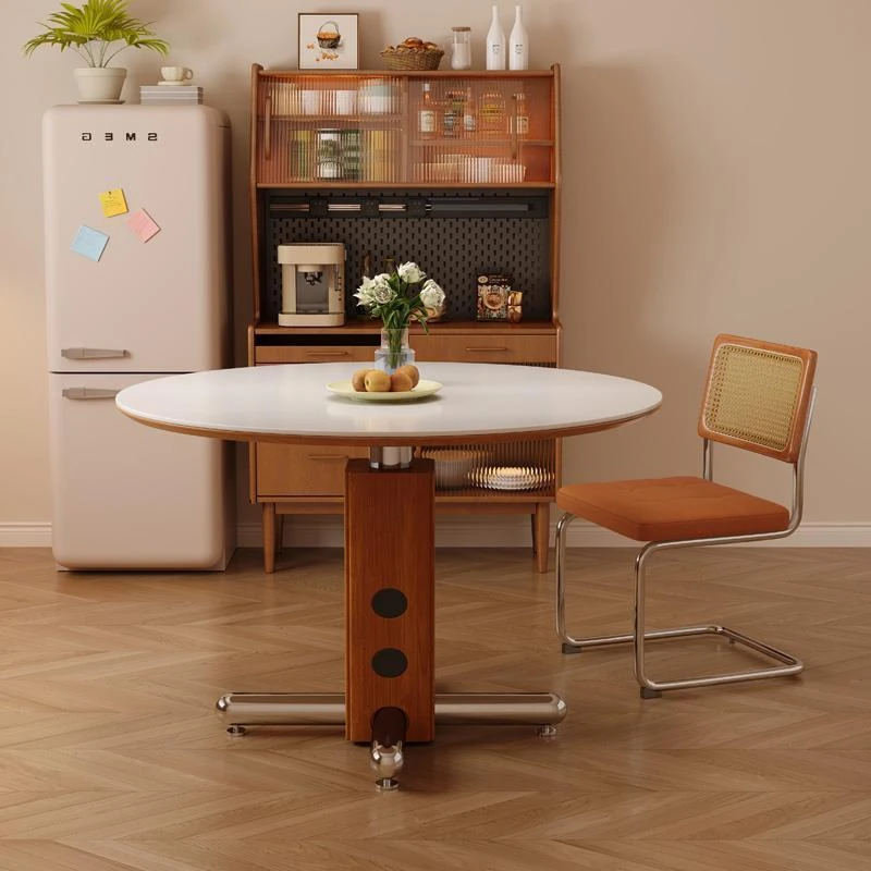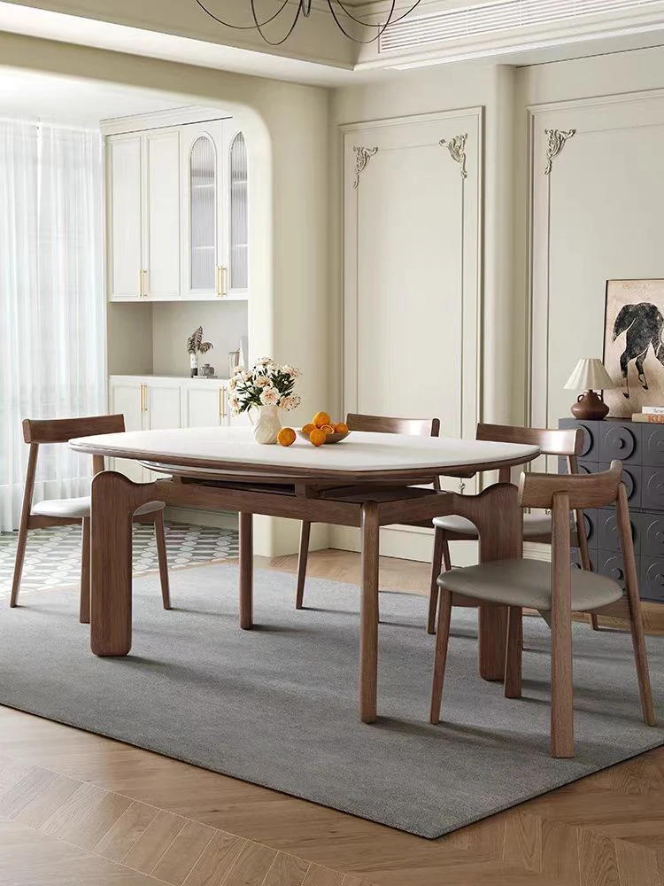 Modern Minimalist Luxury Expandable Dining Table with Round and Square Design - Perfect for Small to Medium Homes, Featuring Sturdy Elephant Leg Solid Wood and Rock Slab.