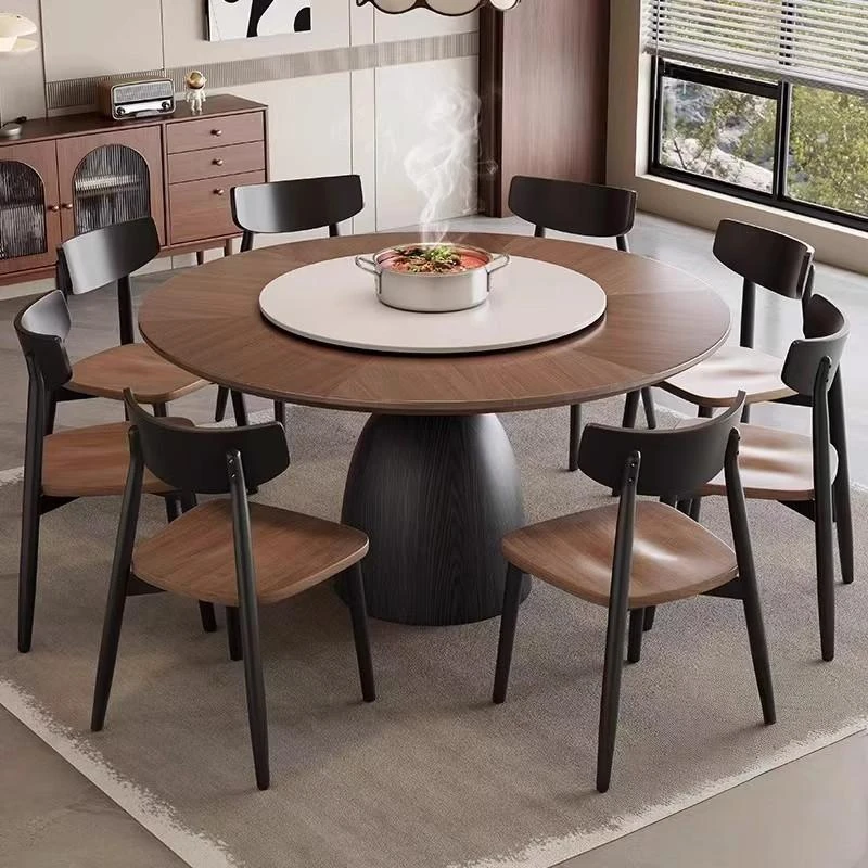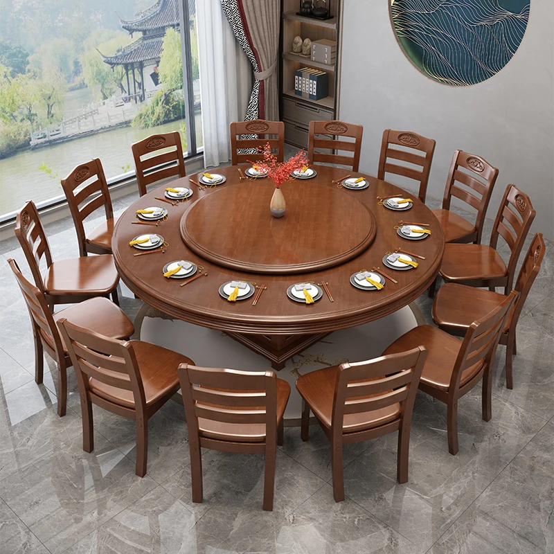 Modern Chinese-Style Solid Wood Round Dining Table Set for Home and Hotels – Seats Up to 12 People with Electric Hot Pot and Rotating Tray, Perfect for Family Gatherings and Special Occasions.