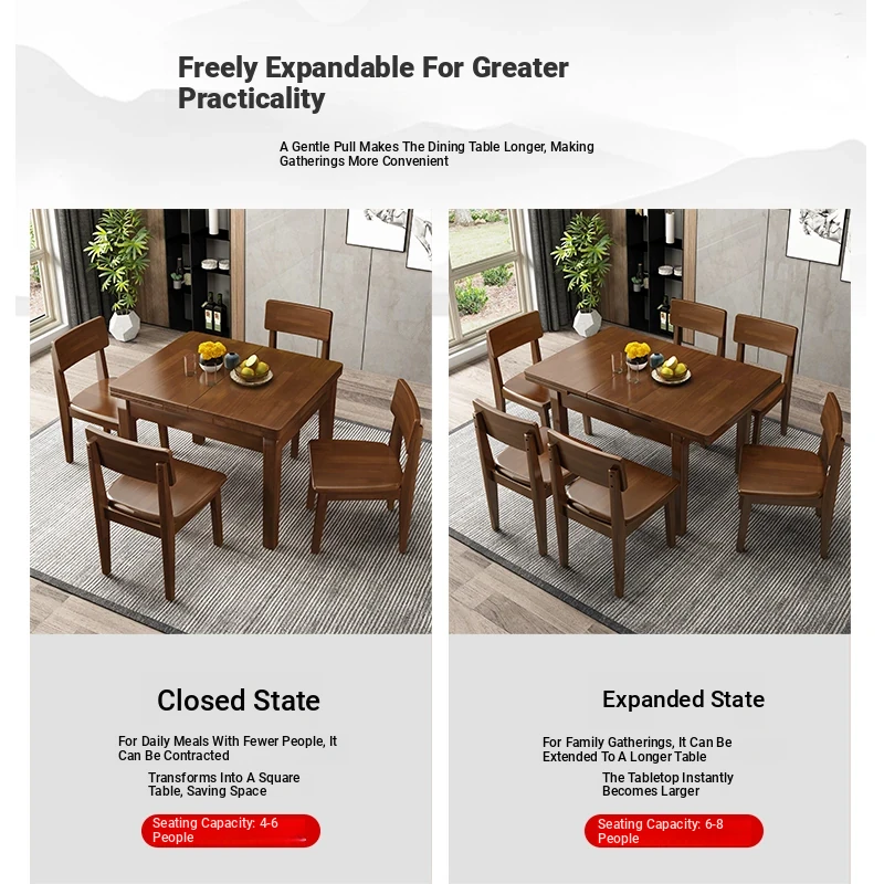Modern Minimalist Solid Wood Dining Table and Chair Set for 6 - Rectangular Expandable Folding Table for 4, Perfect for Small Spaces and Home Use