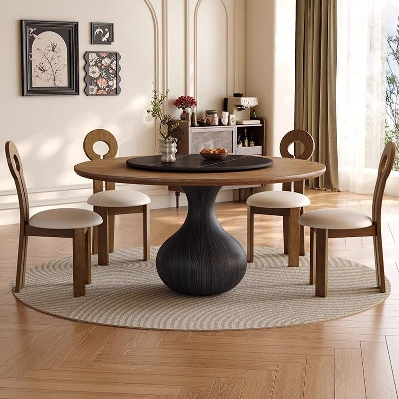 Modern Minimalist Round Rock Plate Dining Table and Chair Set - Stylish and Compact Design for Small Spaces, Elegant Solid Wood Round Table with Rotating Feature for Luxurious Dining Experience.