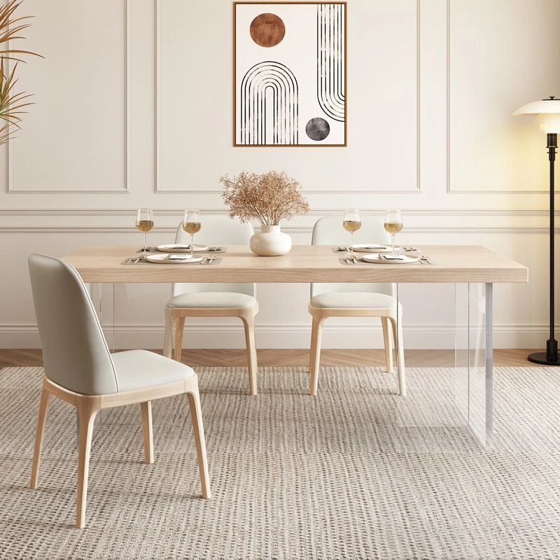 Creamy Elegant Solid Wood Island Dining Table with Acrylic Legs - A Modern Touch for Your Home Restaurant, Perfect for Luxurious Dining Experiences.