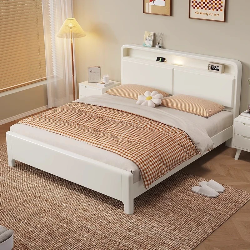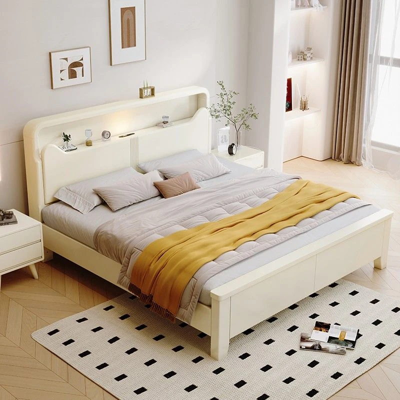 Modern Minimalist Solid Wood Bed with Cream Finish – Space-Saving 1.5m/1.8m Double Bed with Integrated Lighting and Storage for Small Homes