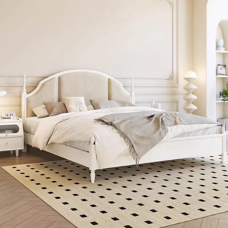 Vintage-Inspired White Upholstered Nordic Solid Wood Bed - Modern Minimalist High-End Double Bed for Master Bedroom, Luxurious Couple's Wedding Bed
