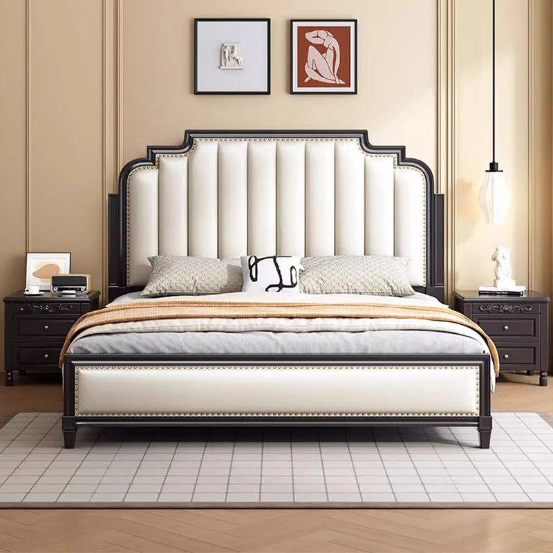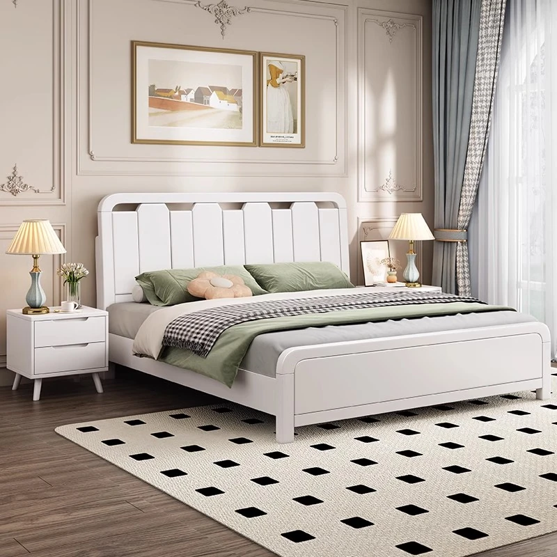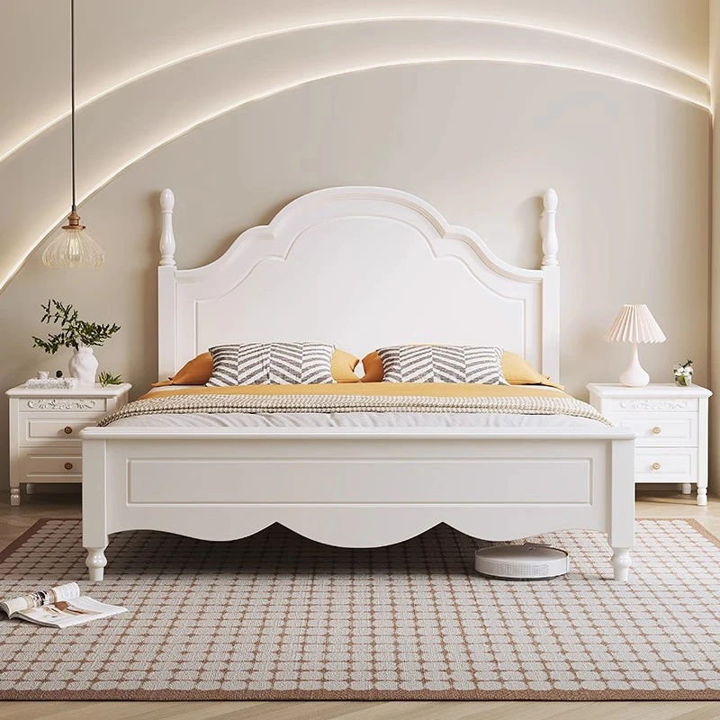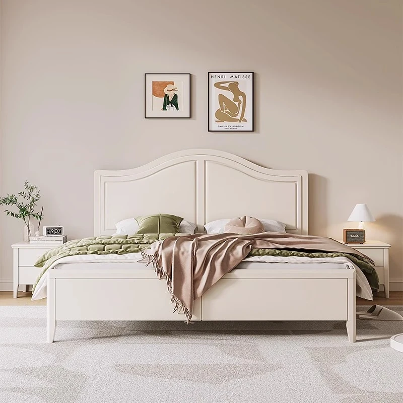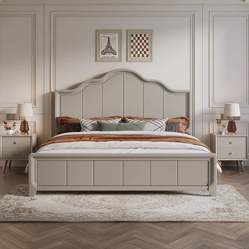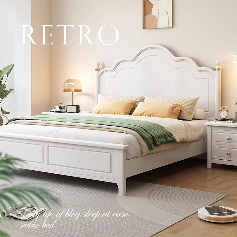 French Vintage Solid Wood Bed - Modern Minimalist Double Bed for Main Bedroom, 1.5m and 1.8m Windsor Style, Perfect for Couples and Newlyweds.