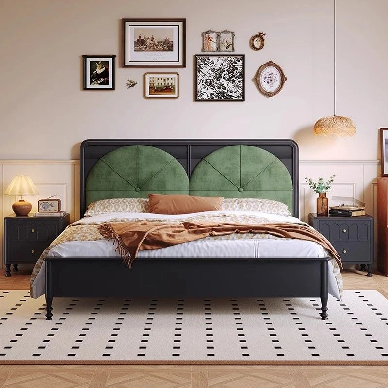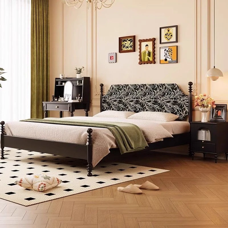 Black Vintage French Style Solid Wood Bed – Luxury Mid-Century Modern Design for Master Bedroom, 1.8m Double Bed – Stylish and Minimalist Furniture for a Chic Home.