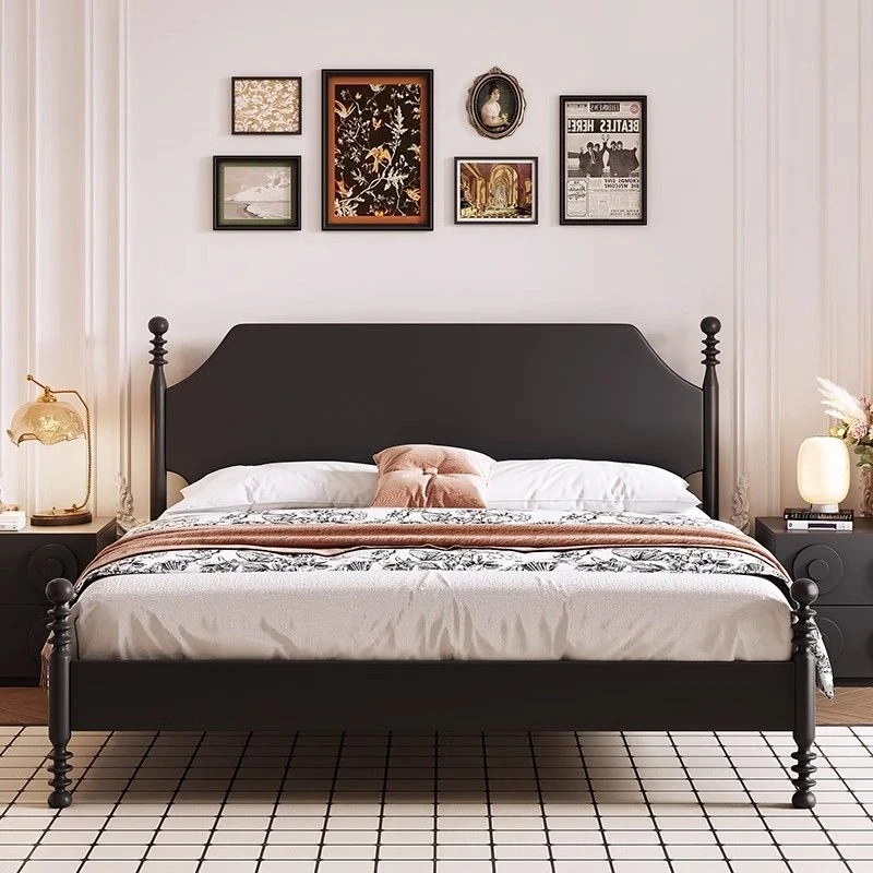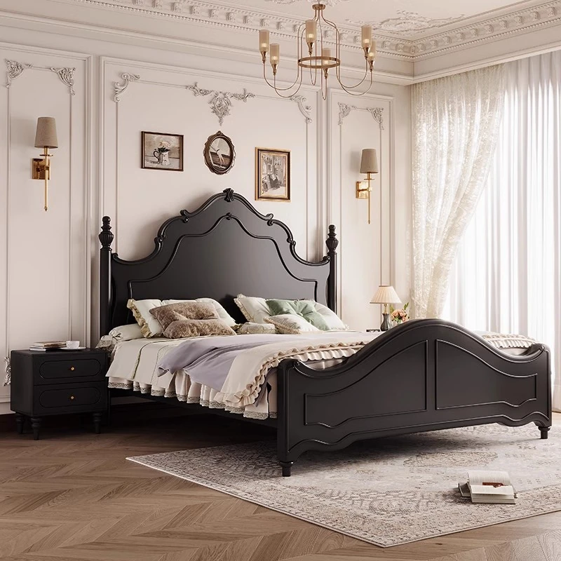 Vintage Solid Wood French-Style Black Bed - Modern Minimalist 1.5m Double Bed for Master Bedroom - Chic and Elegant Furniture for a Touch of Luxury