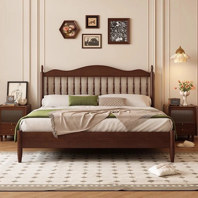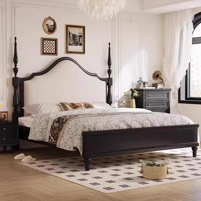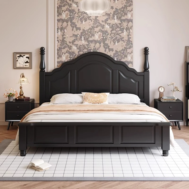 Black Vintage Retro Bed - American Solid Wood Queen Size (1.8m) & Full Size (1.5m) - French Roman Holiday Style for Master Bedroom, Perfect for Chic Decor Enthusiasts!