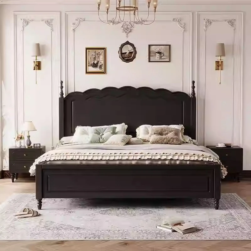 Modern American Country 1.5m Luxury Vintage French Style Black Solid Wood Double Bed - Elegant and Chic for Your Master Bedroom