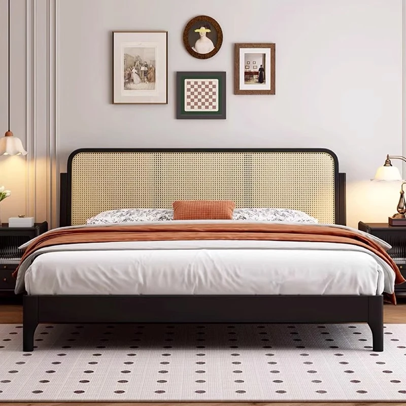 Rustic Rattan Woven Vintage Solid Wood Double Bed - Elegant and Minimalist Design for Master Bedroom, High-End Aesthetic with Wabi-Sabi Influence, Perfect for a Cozy Retreat