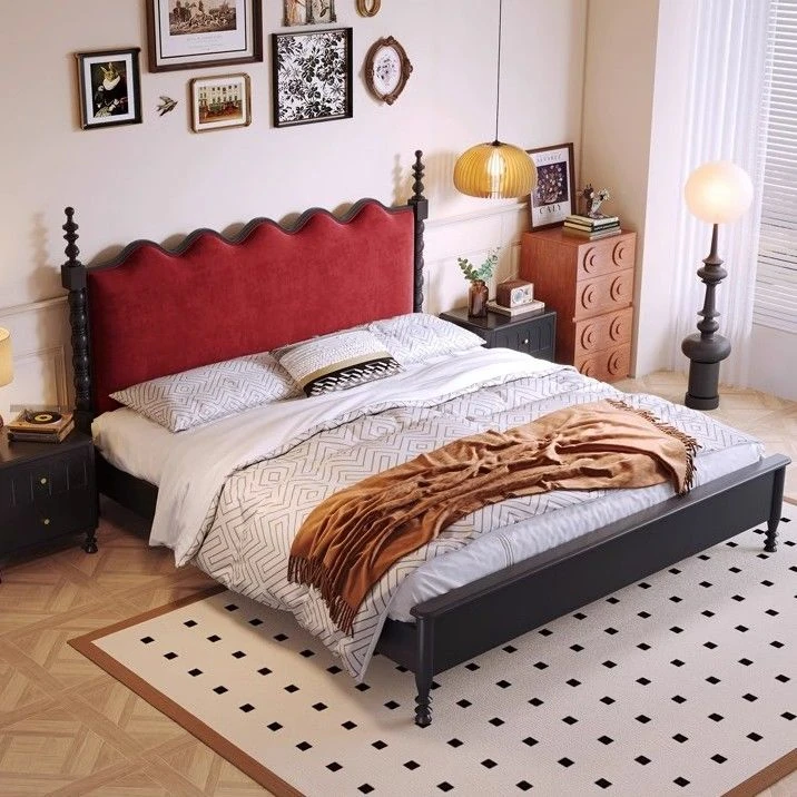 French Vintage Solid Wood Bed - Retro Style King Size Bed for Master Bedroom, American Light Luxury Design, Elegant Black Wave Soft Upholstery, Noise-Free Comfort.