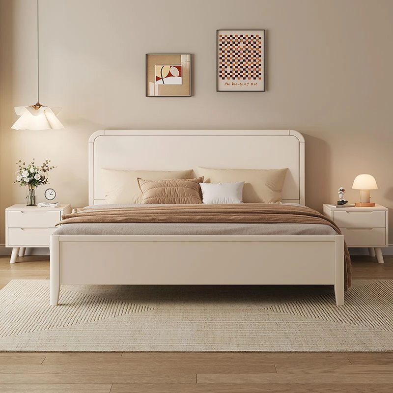 Creamy Wood Bed - 1.8m & 1.5m French Minimalist Double Bed for Master Bedroom, Perfect for Small Spaces with High Storage Box - Stylish & Functional Design for Couples