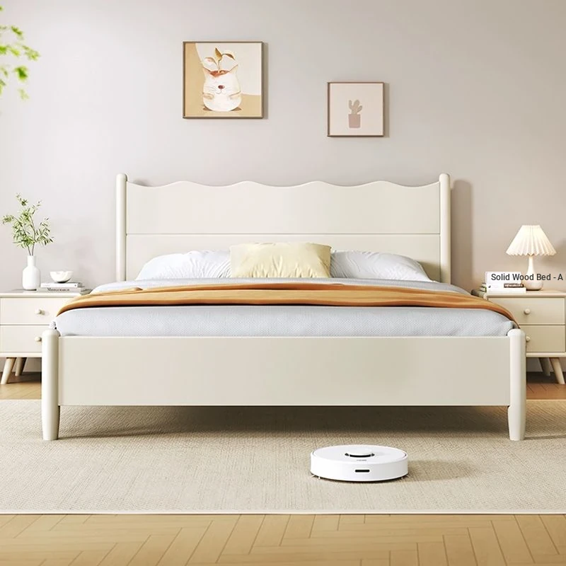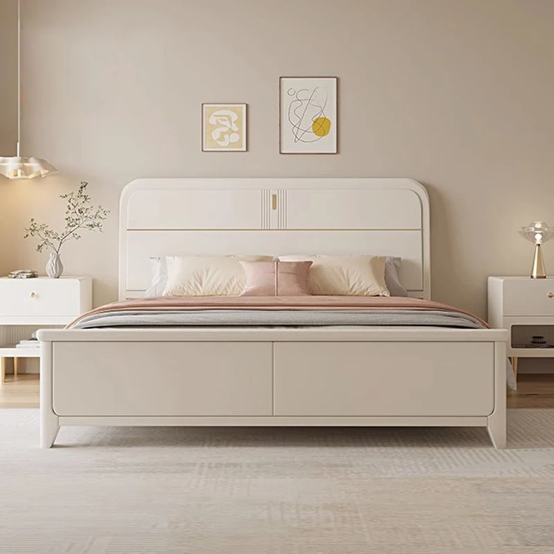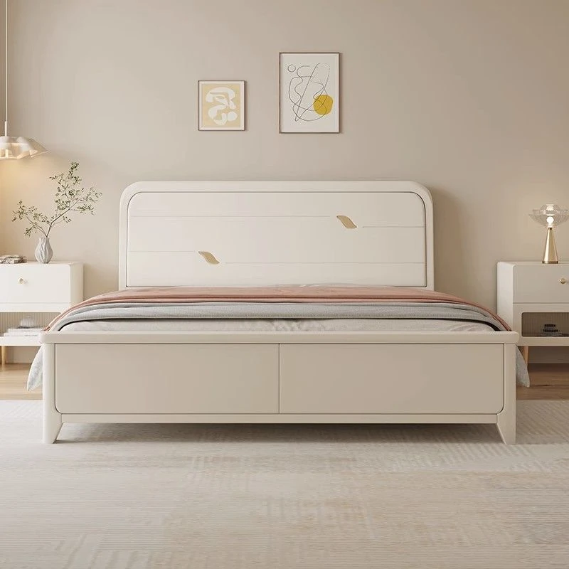 Modern Minimalist Solid Wood Bed - Cream White Double Bed for Master Bedroom, 1.5m/1.8m Size with Storage Solution - Stylish and Functional Design for a Cozy Home