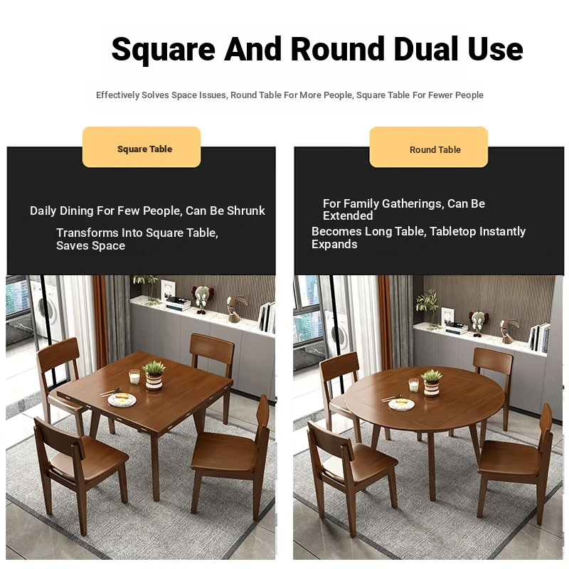 Modern Solid Wood Folding Dining Table for Small Homes - Versatile Expandable Round and Square Table and Chair Set, Perfect for Minimalist Living Spaces