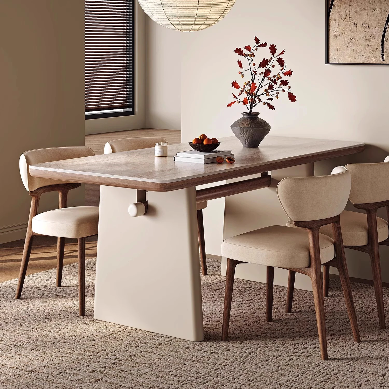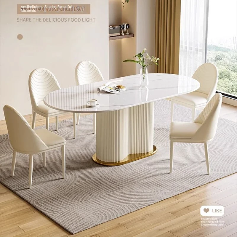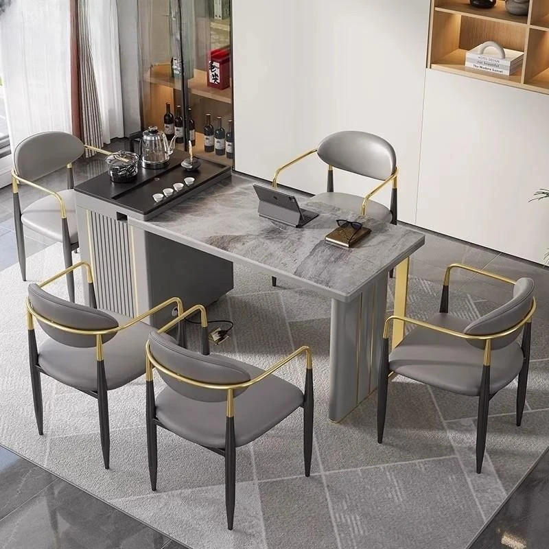 Elegant Cream-Style Multifunctional Rock Slab Dining and Tea Table with Extendable Design – Perfect for Office or Home, Featuring a Sleek Minimalist Aesthetic with Comfortable Chair Set.