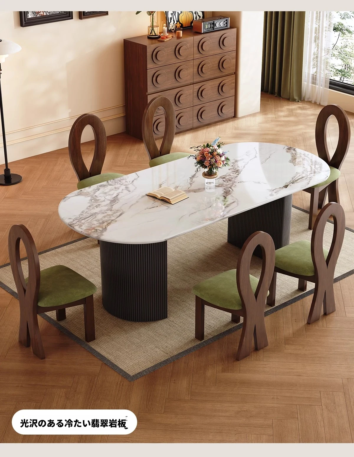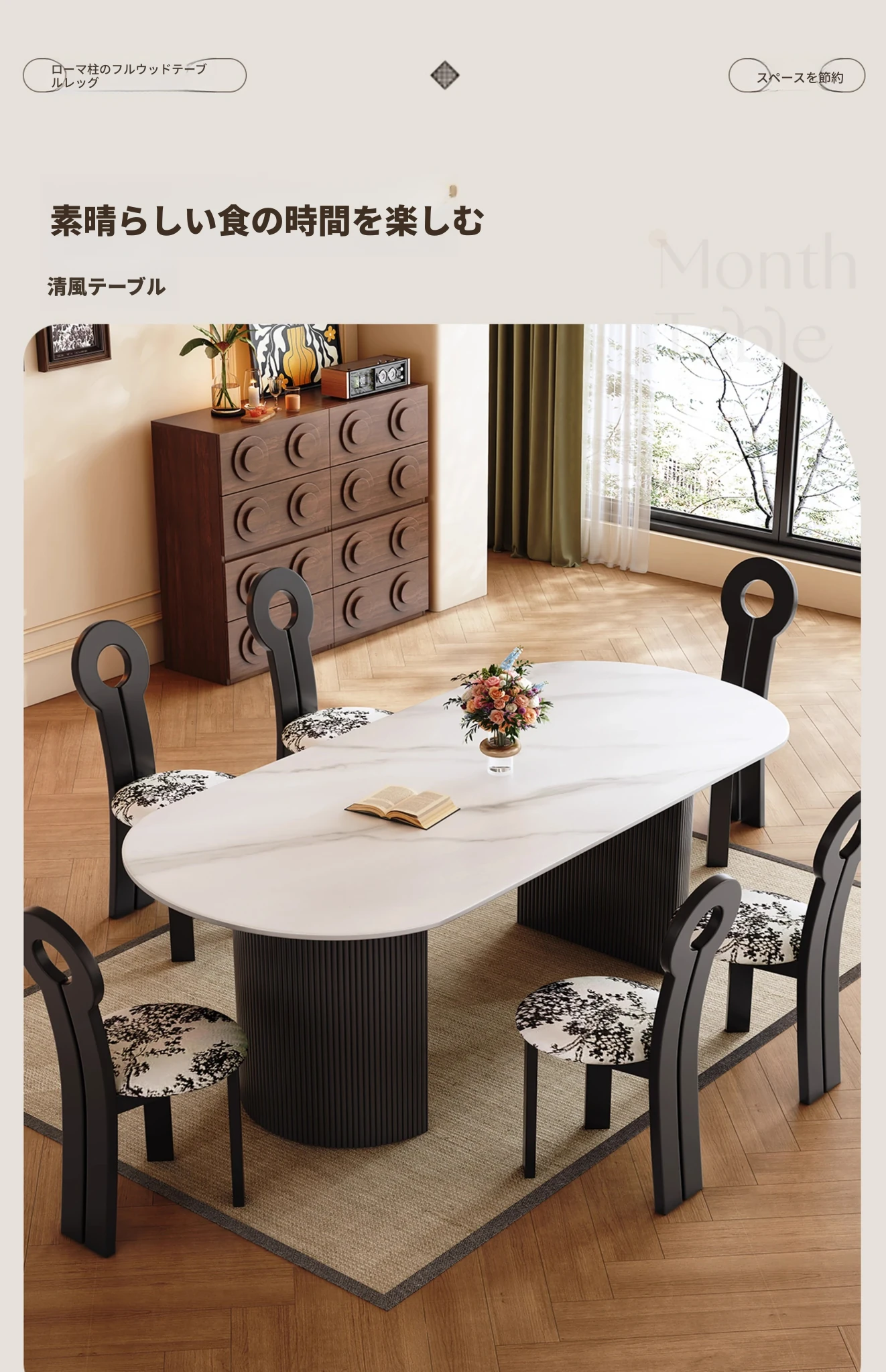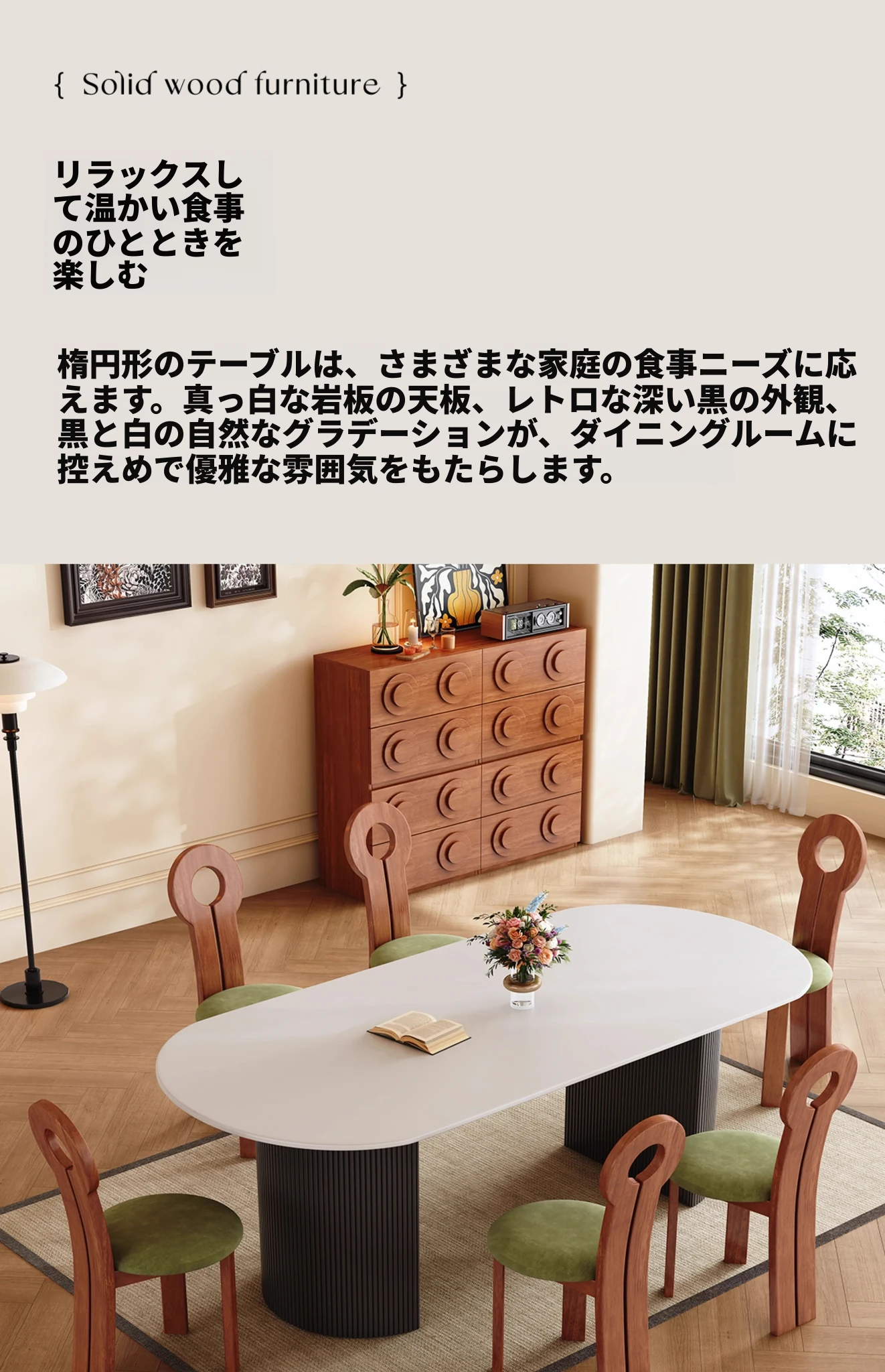 軽やかなラグジュアリーの大理石風ダイニングテーブル!モダンでミニマルなフレンチヴィンテージデザイン、実木製の椅子とのコンビネーション。小さなスペースにもぴったりなエレガントな楕円形テーブルで、家族や友人と特別な食事を楽しもう!