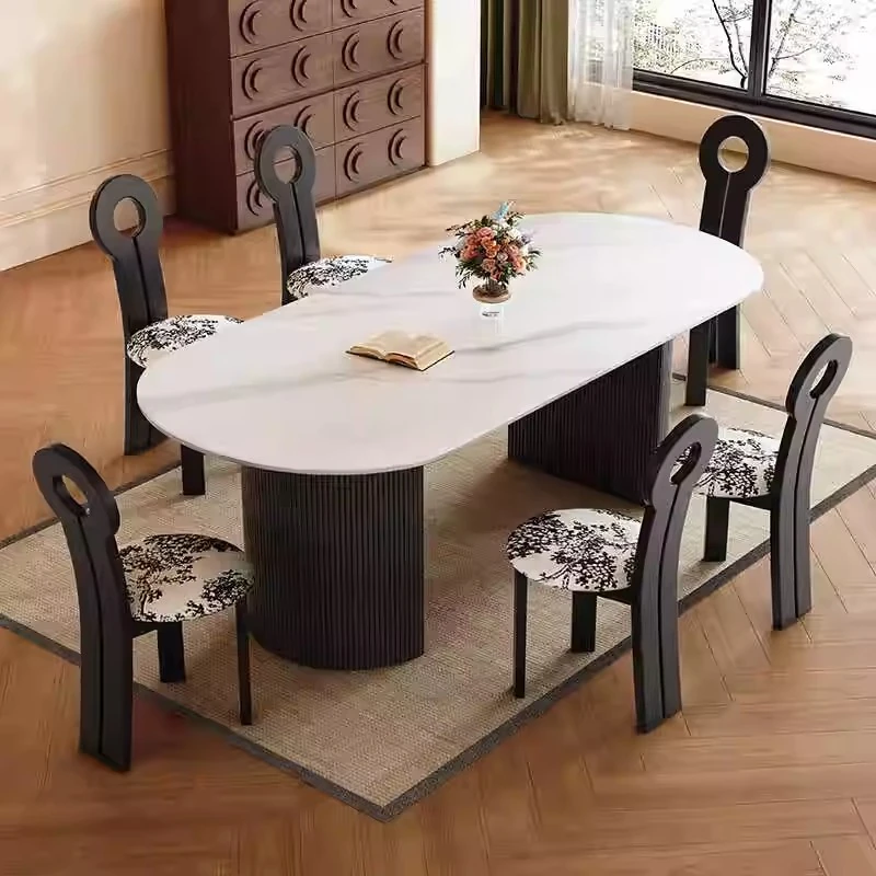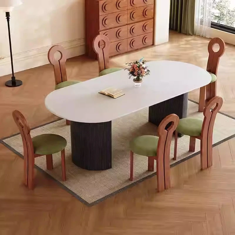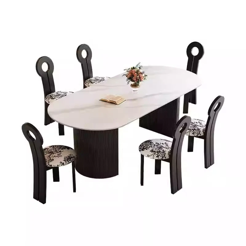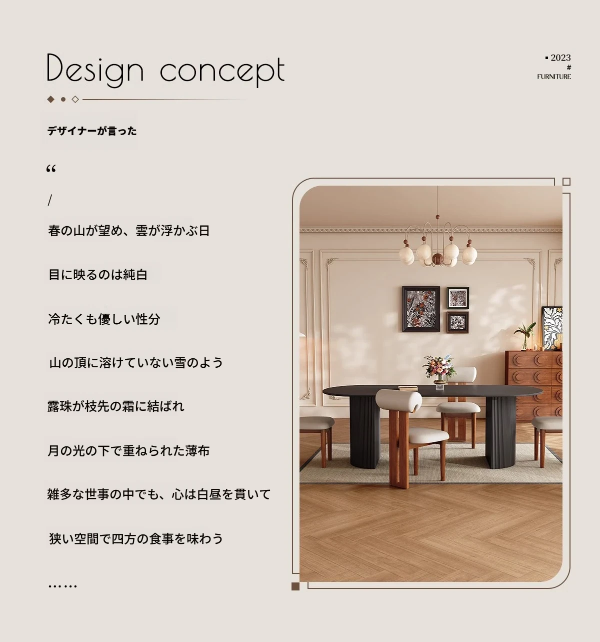 軽やかなラグジュアリーの大理石風ダイニングテーブル!モダンでミニマルなフレンチヴィンテージデザイン、実木製の椅子とのコンビネーション。小さなスペースにもぴったりなエレガントな楕円形テーブルで、家族や友人と特別な食事を楽しもう!