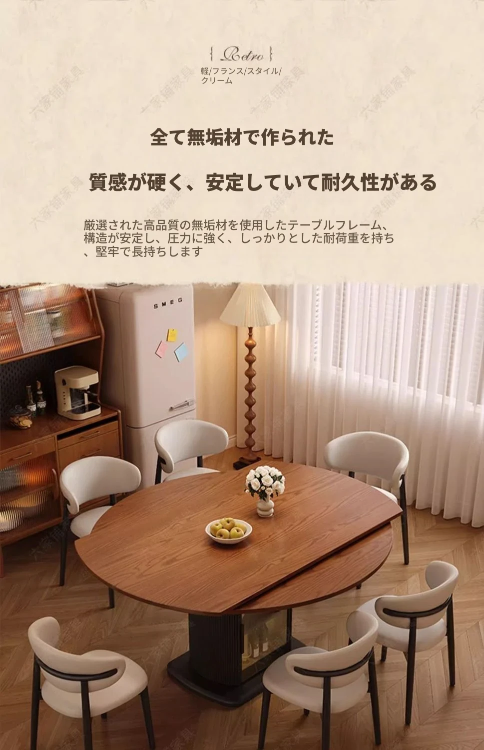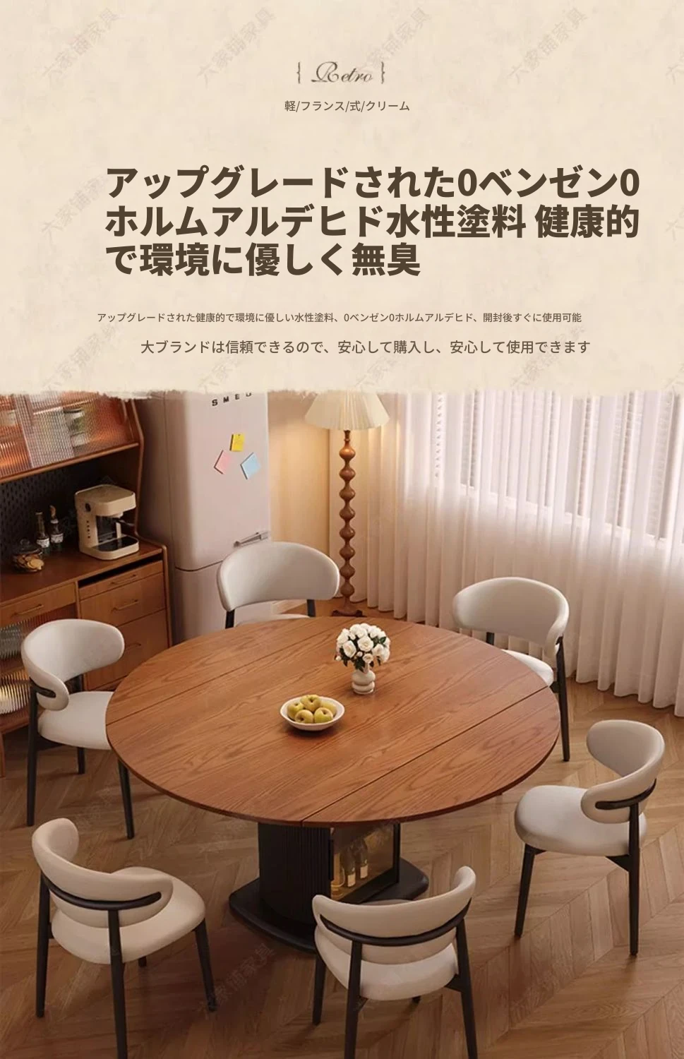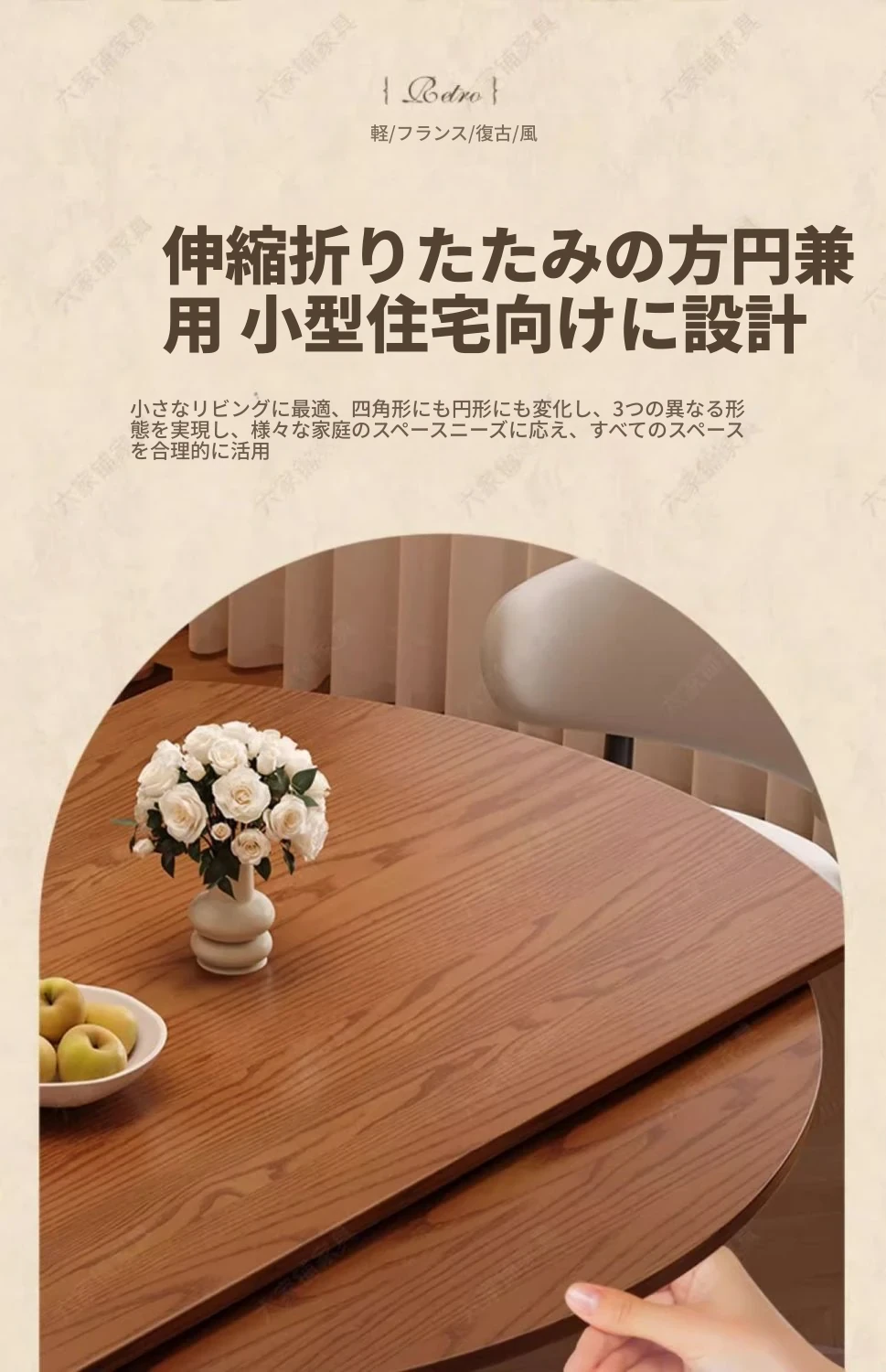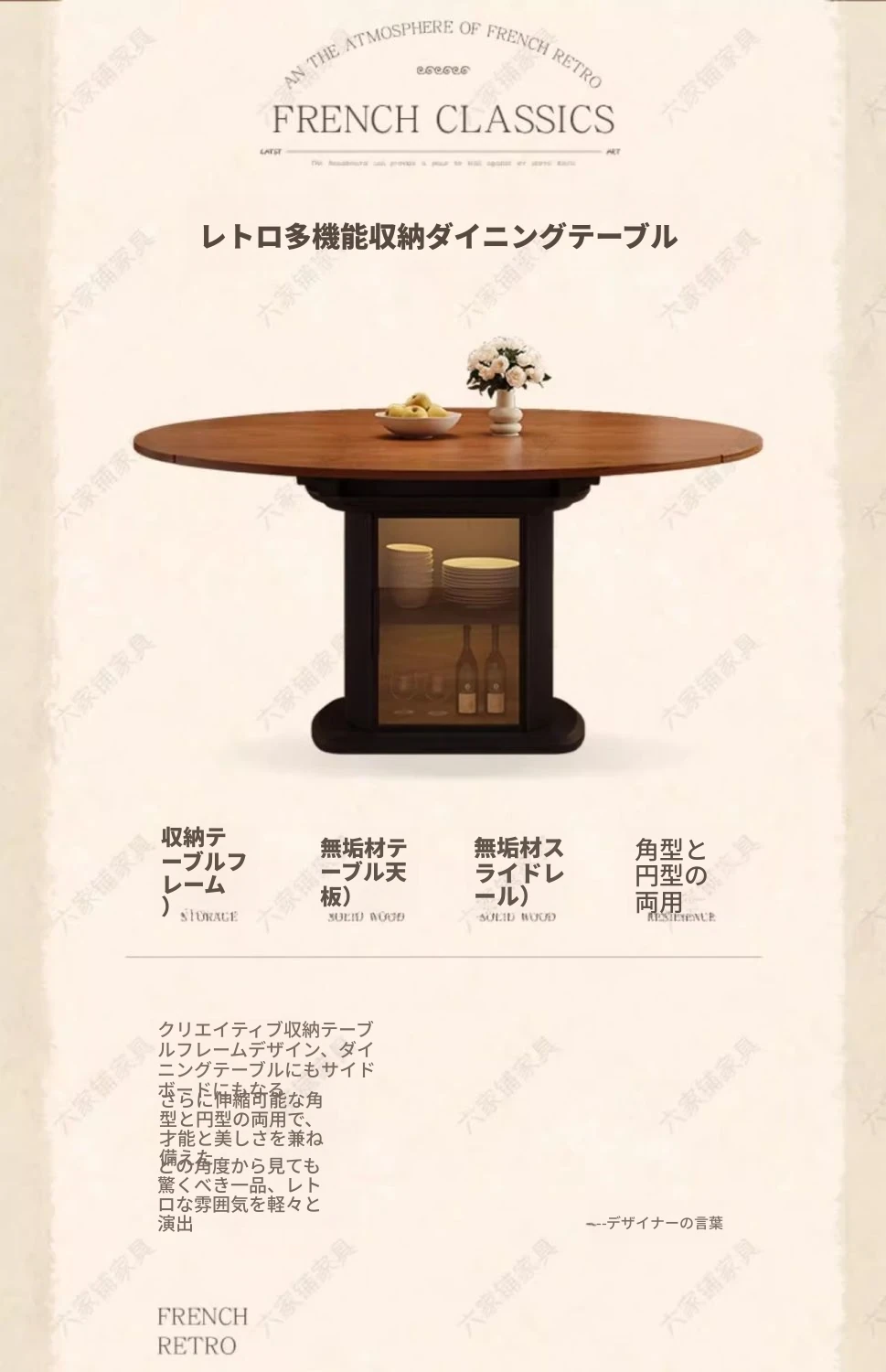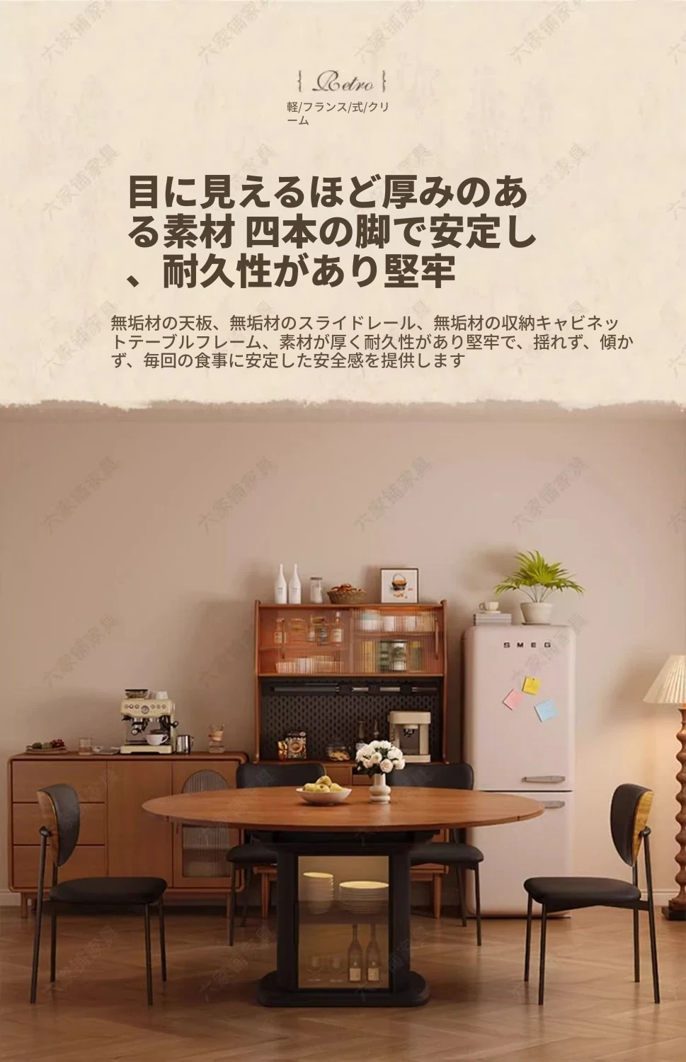 フランス風ヴィンテージ可伸縮実木ダイニングテーブル 多機能収納 家庭用小型折りたたみ二用途キャビネット 丸テーブルで、おしゃれで実用的な空間を演出!