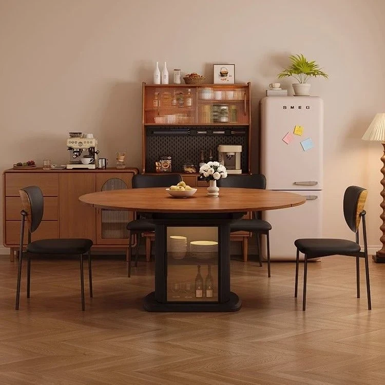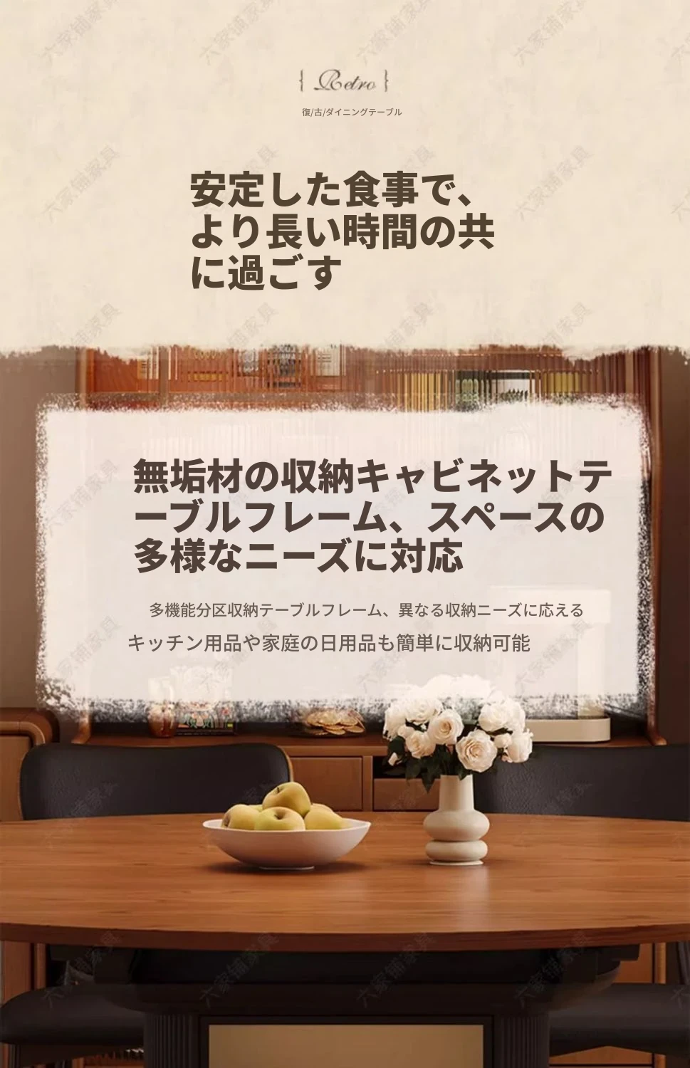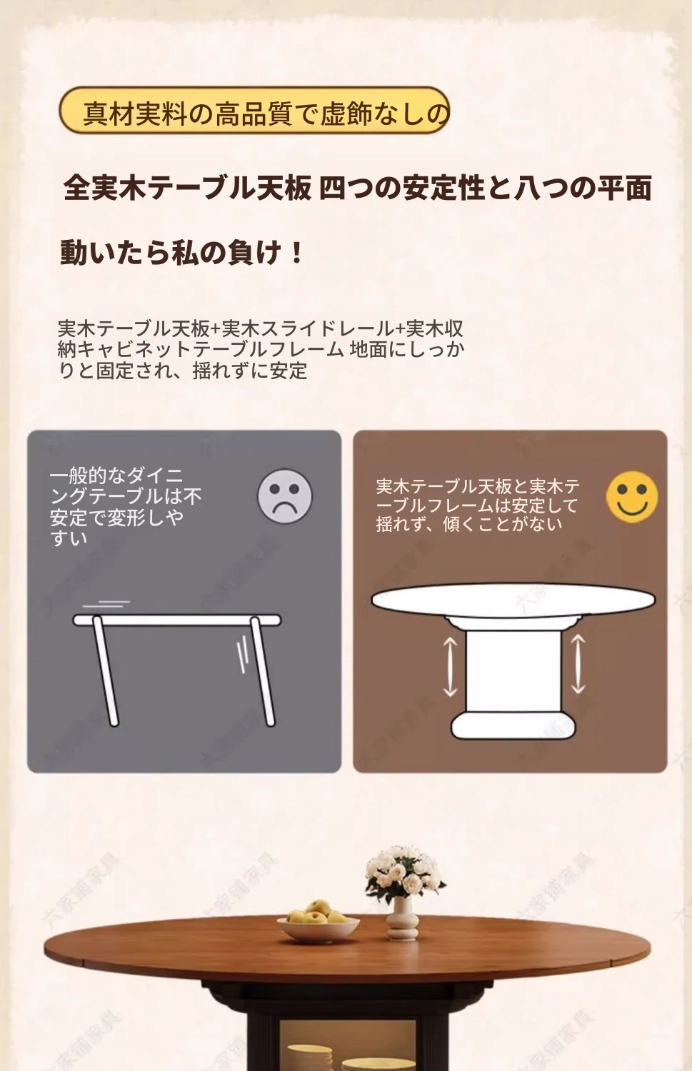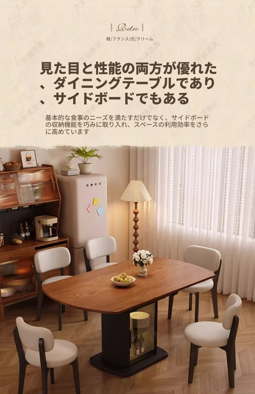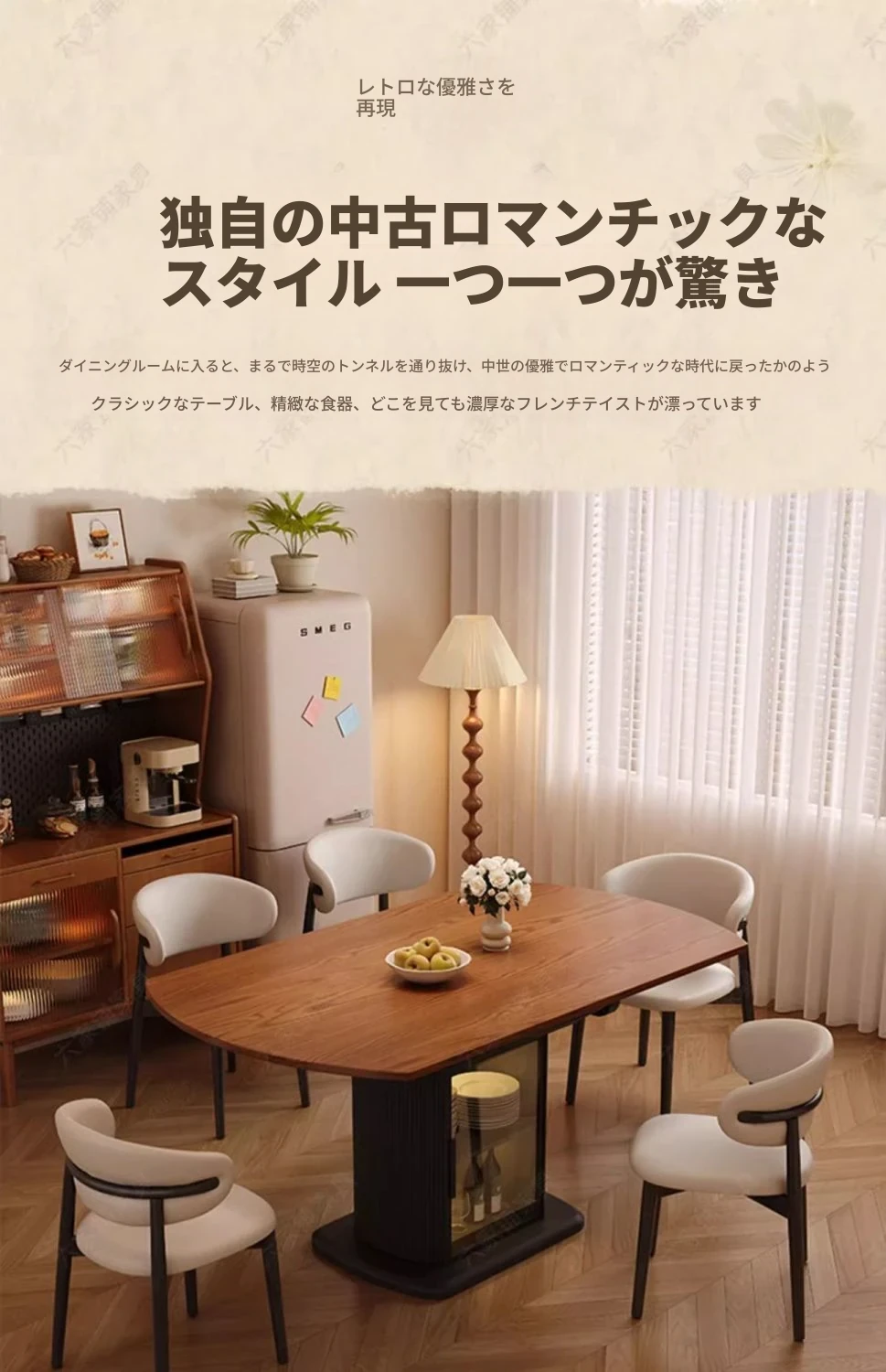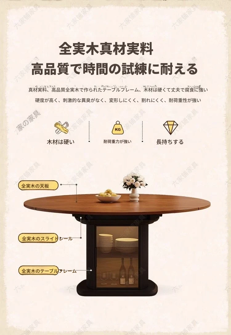 フランス風ヴィンテージ可伸縮実木ダイニングテーブル 多機能収納 家庭用小型折りたたみ二用途キャビネット 丸テーブルで、おしゃれで実用的な空間を演出!