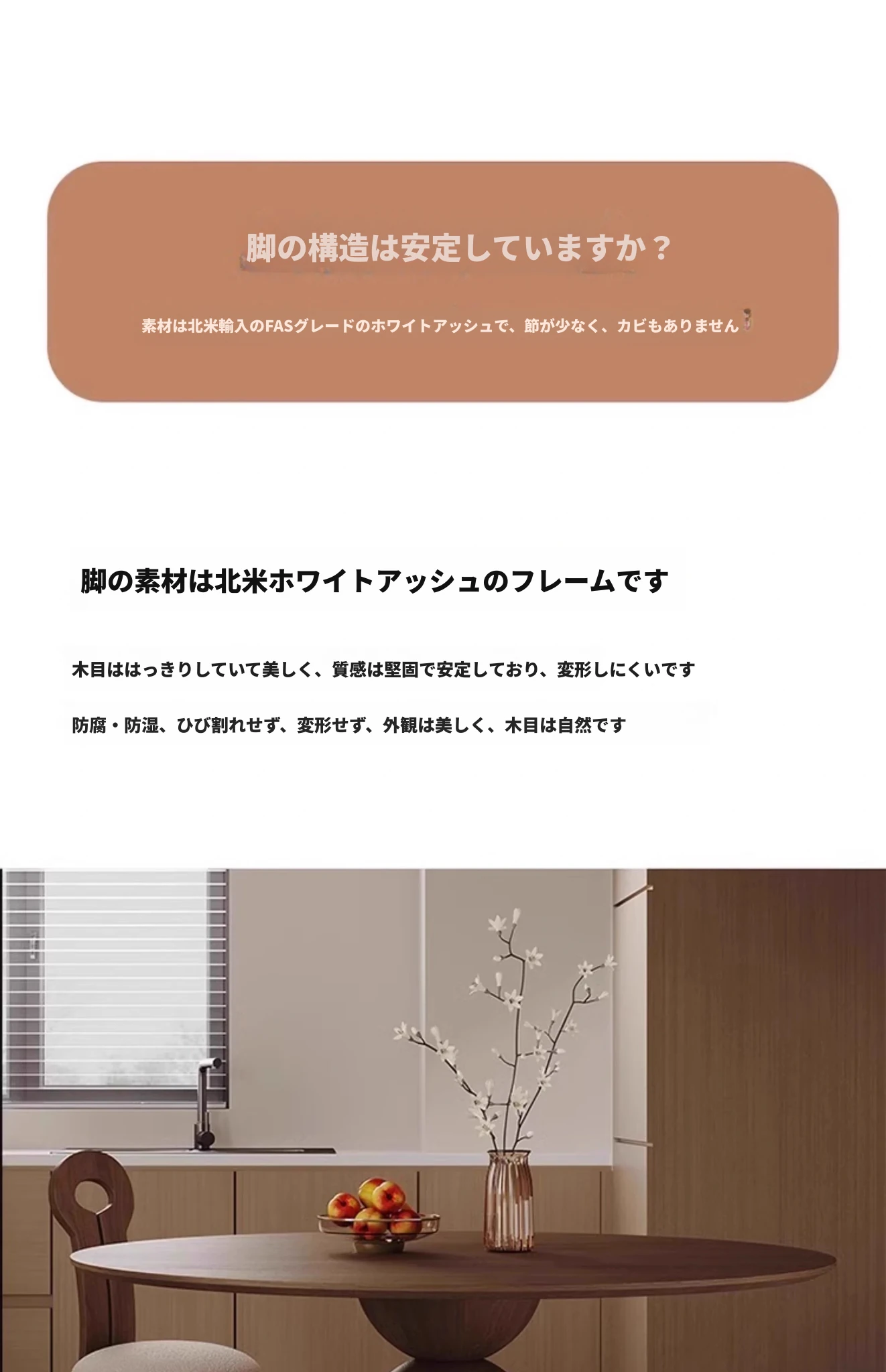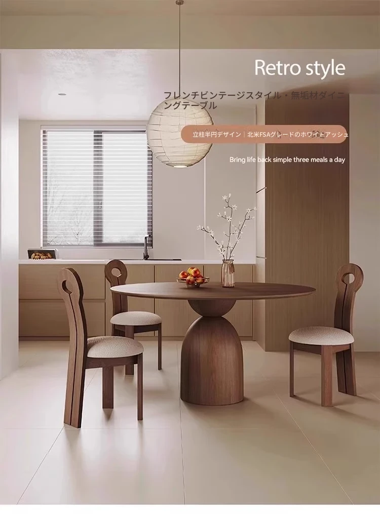 フランス風レトロデザインの無垢材ダイニングテーブル - 中古のホワイトアッシュウッドの木目が美しいラウンドテーブル。2024年新作、軽やかなラグジュアリー感で、家庭にぴったりの上質な食卓をお届けします。