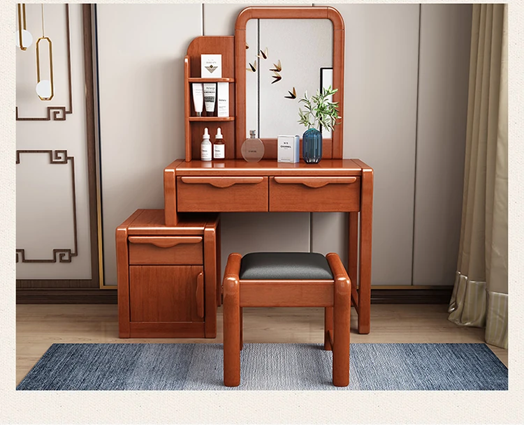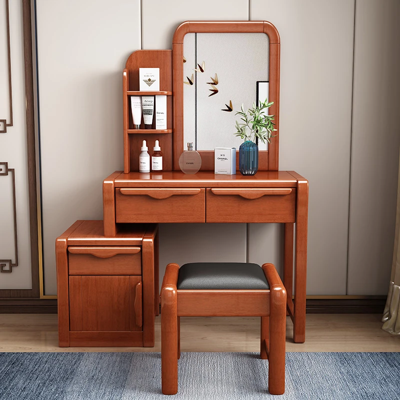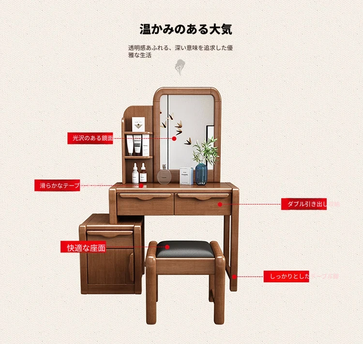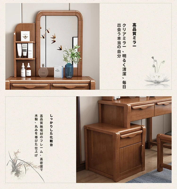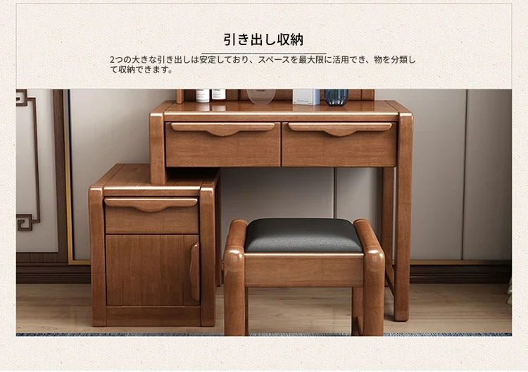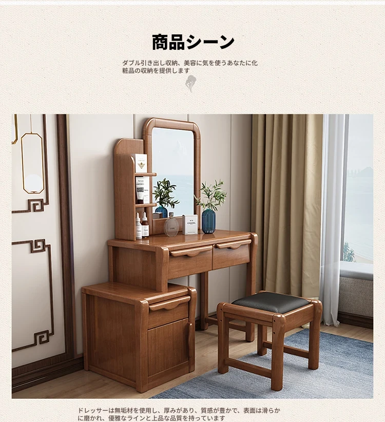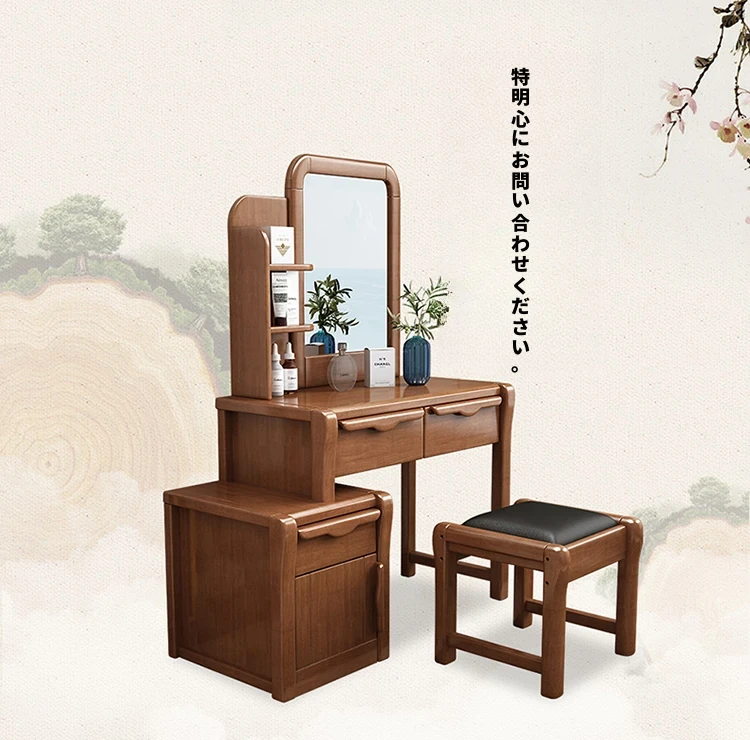 現代中式実木化粧台|寝室用&家庭用|ミラー一体型|収納キャビネット付き|移動可能で多機能!あなたの美を引き立てる完璧なアイテム!
