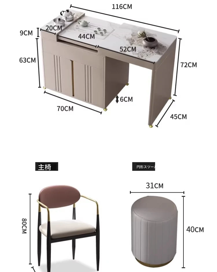 CT04収納茶台+ラグジュアリー椅子*1+丸椅子*4(ダブルホールガラスポット茶炉付き)