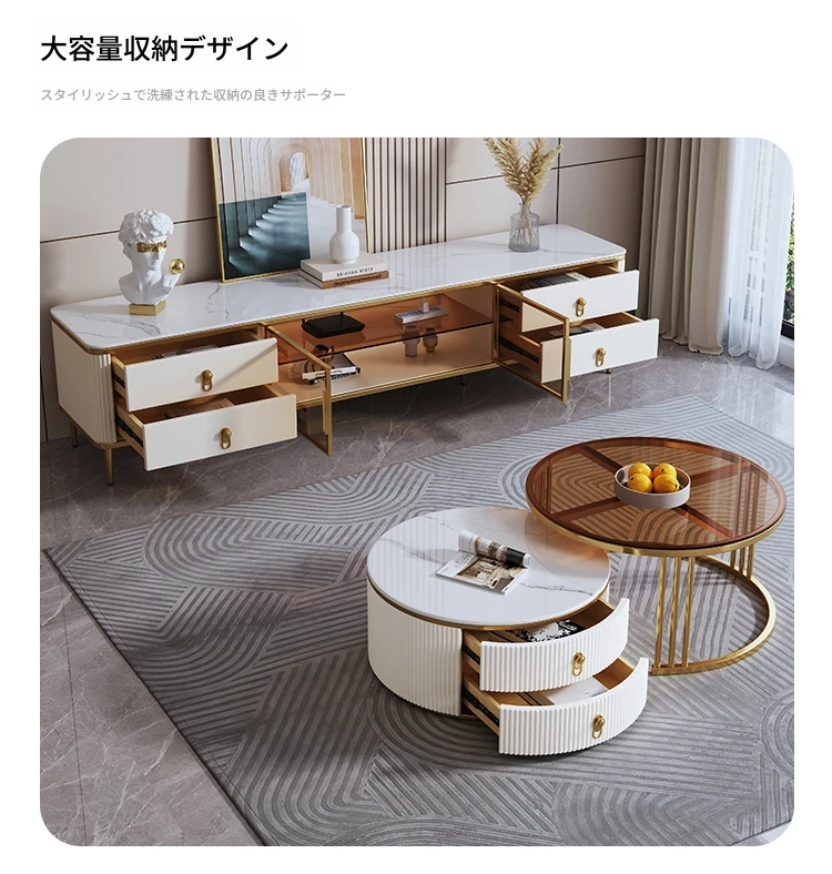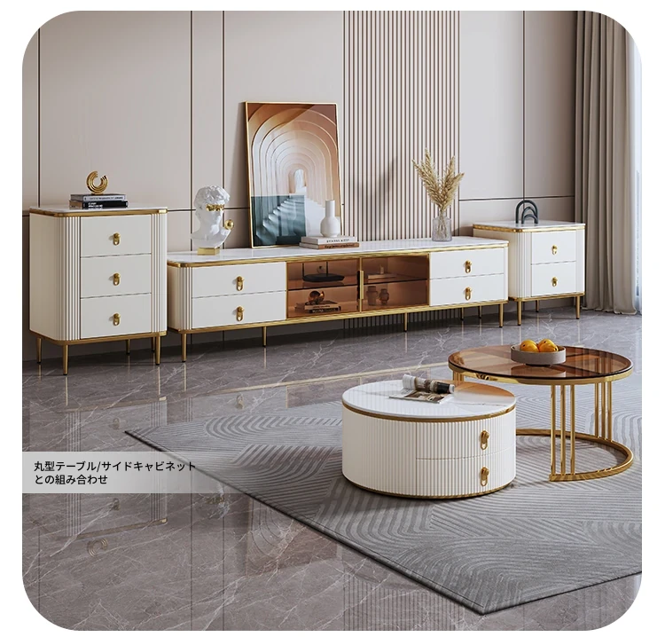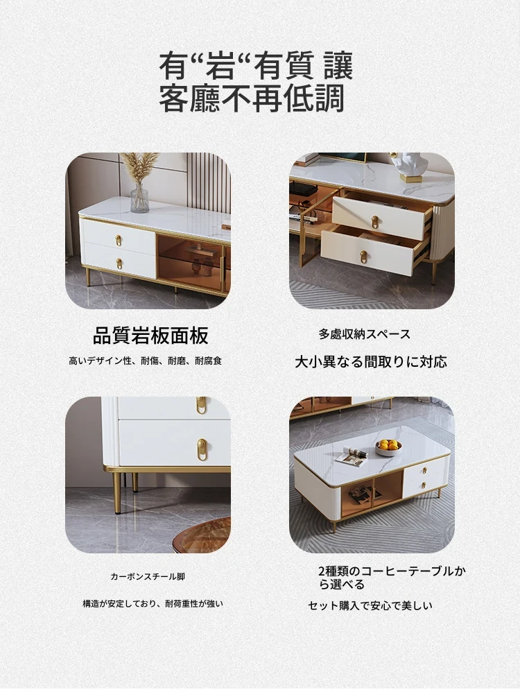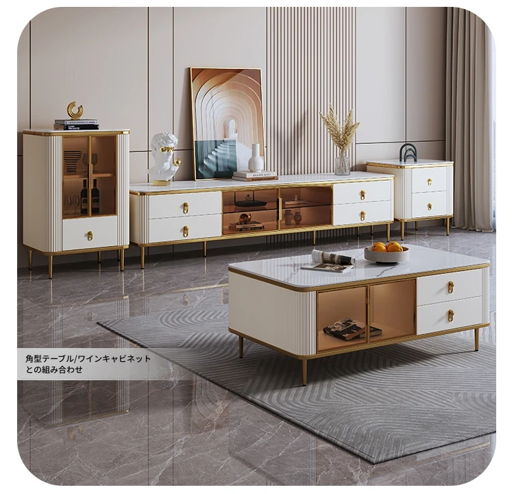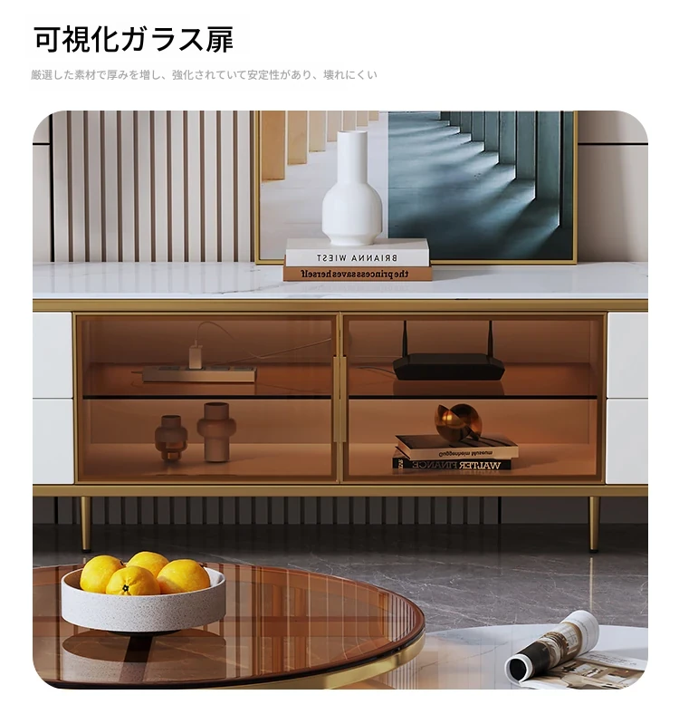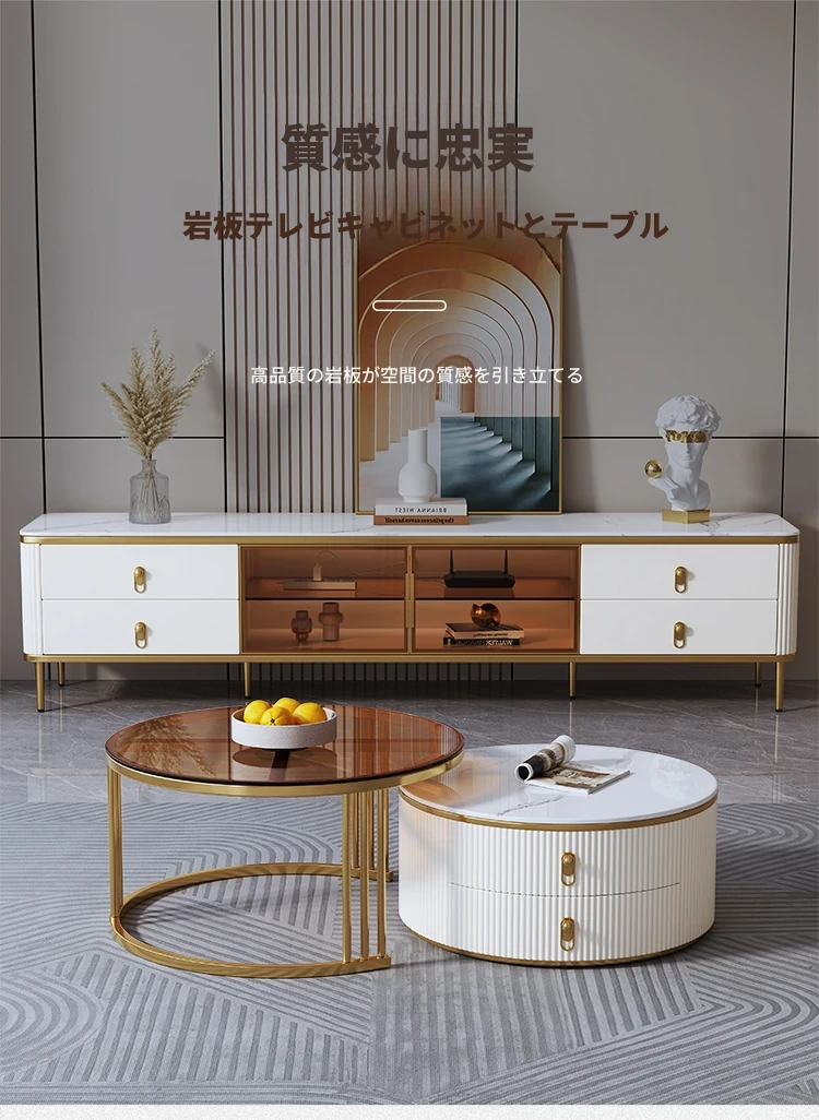 モダンシンプルな岩板テレビボードとテーブルのセット - 家庭用に最適な多機能ガラスサイドキャビネット付き、リビングルームにぴったりのスタイリッシュなデザイン。大きな家でも小さな家でも使える便利なアイテムです!