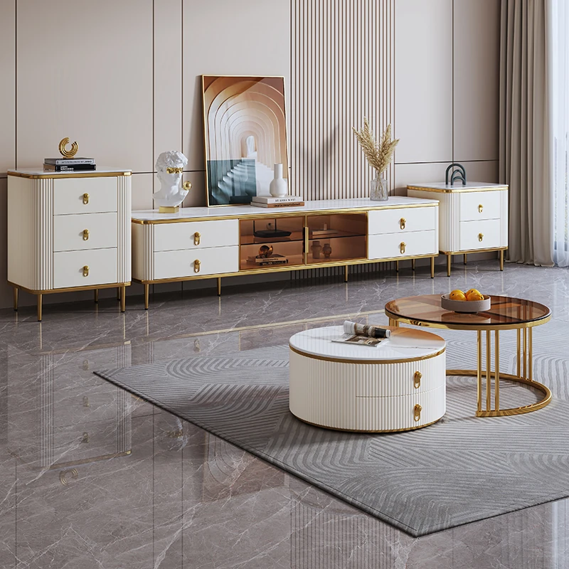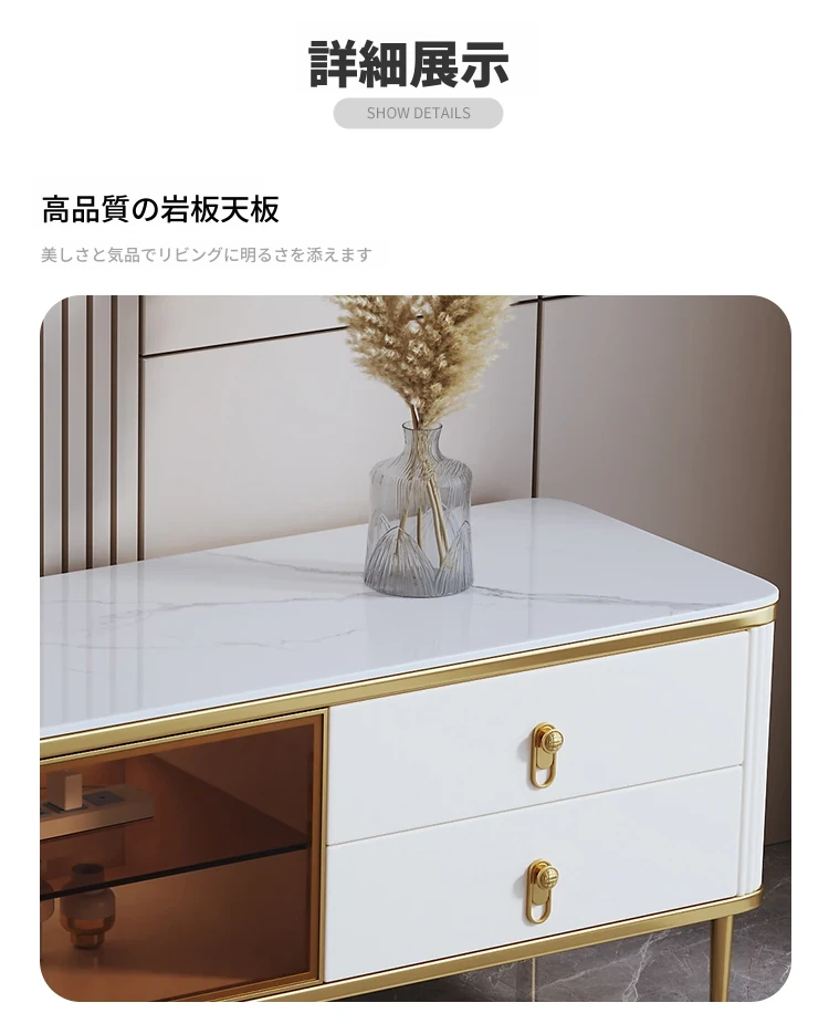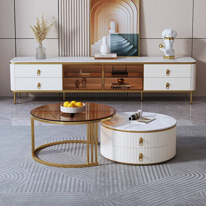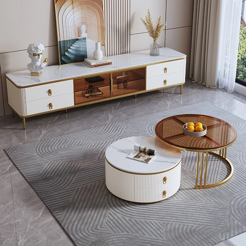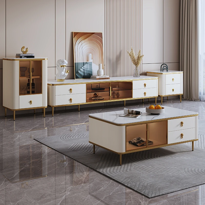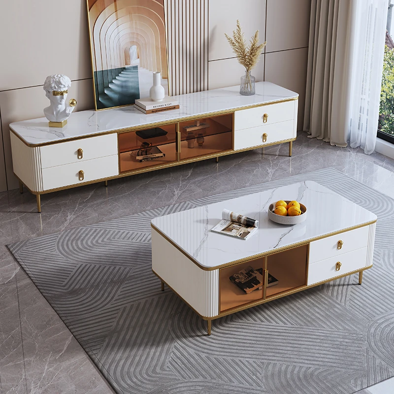 モダンシンプルな岩板テレビボードとテーブルのセット - 家庭用に最適な多機能ガラスサイドキャビネット付き、リビングルームにぴったりのスタイリッシュなデザイン。大きな家でも小さな家でも使える便利なアイテムです!
