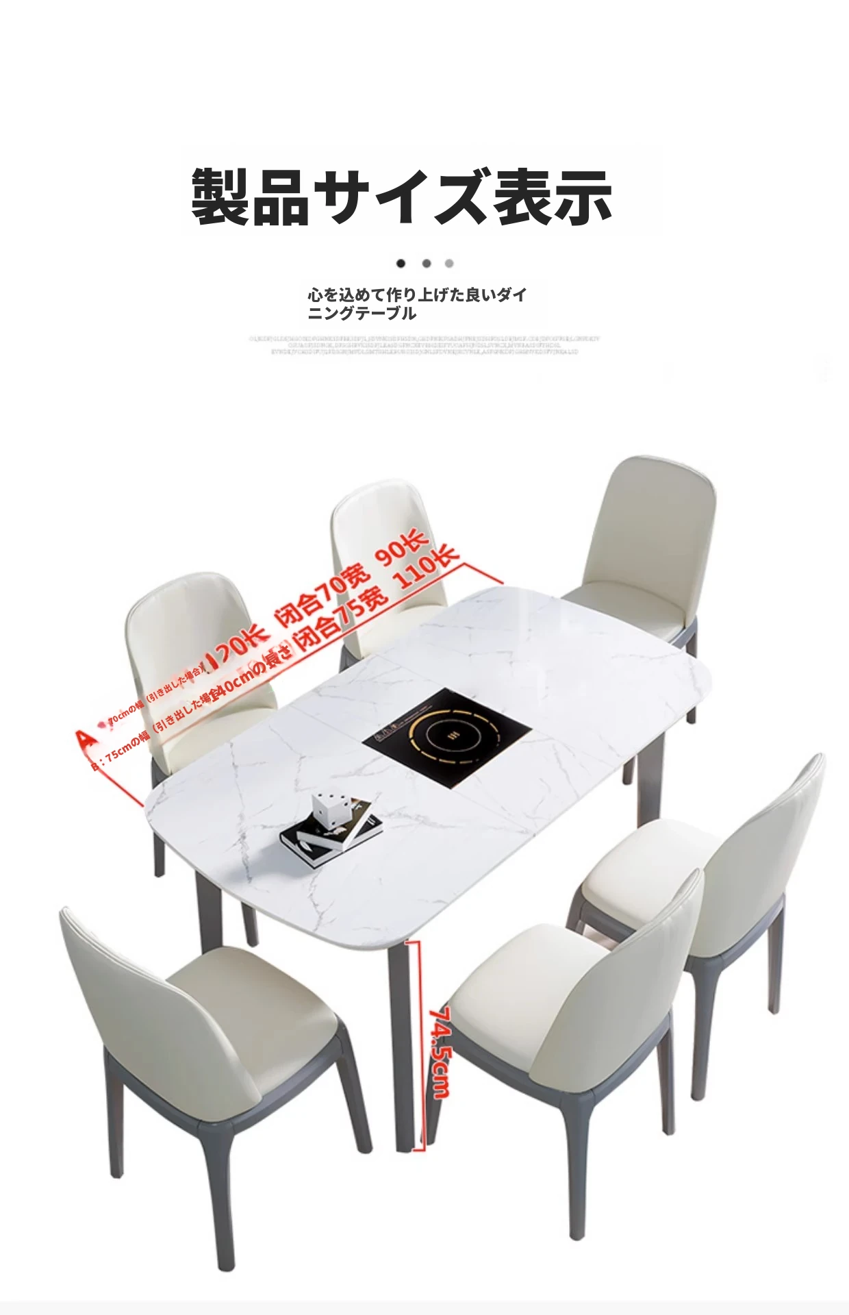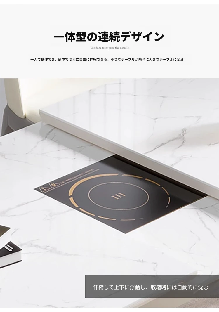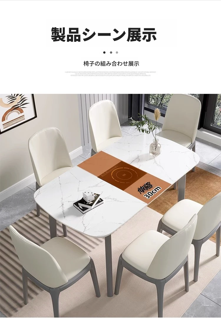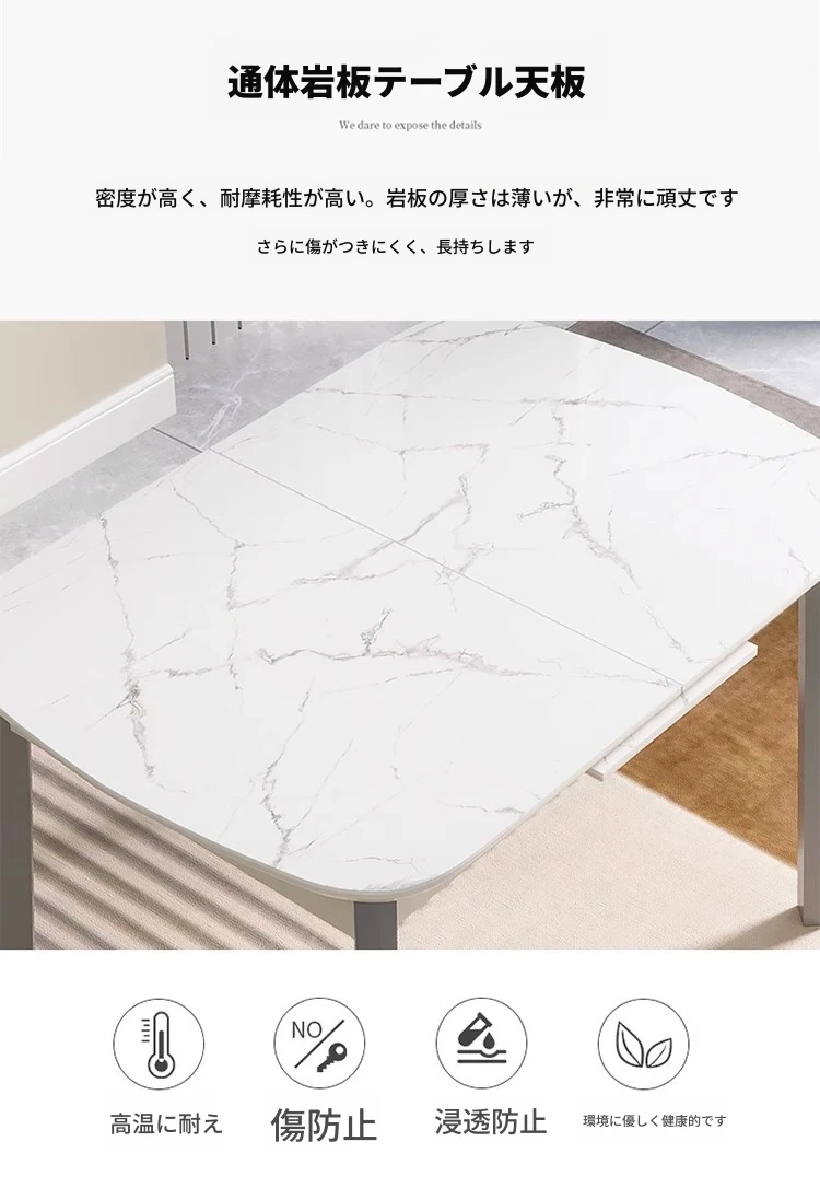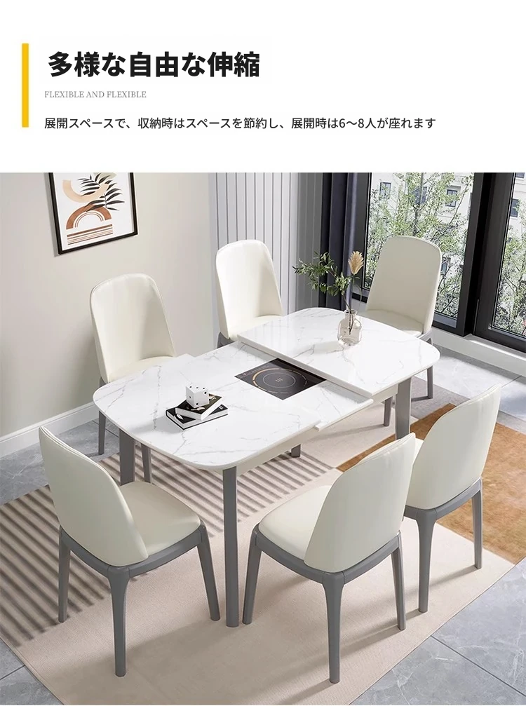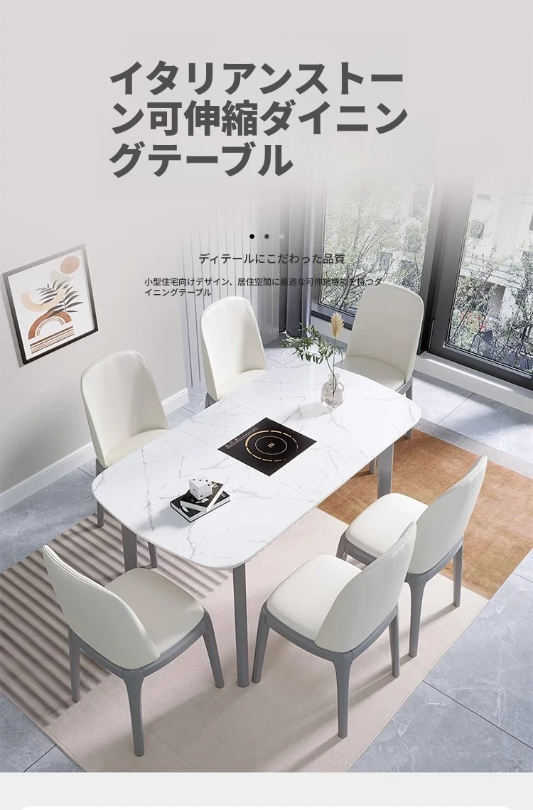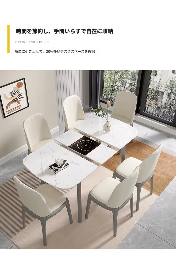 モダンミニマリストデザインのスリムな岩板ダイニングテーブルとチェアセット!多機能で伸縮可能、折りたたみ式の長方形テーブルは、狭いスペースでも使いやすく、家族や友人との楽しい食事に最適です。