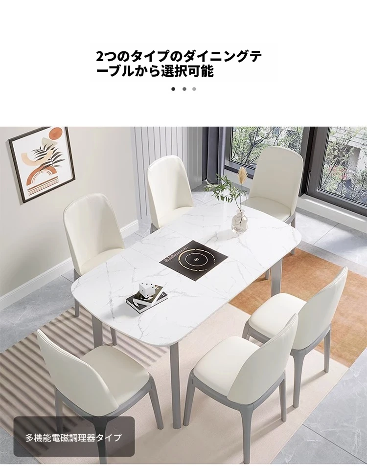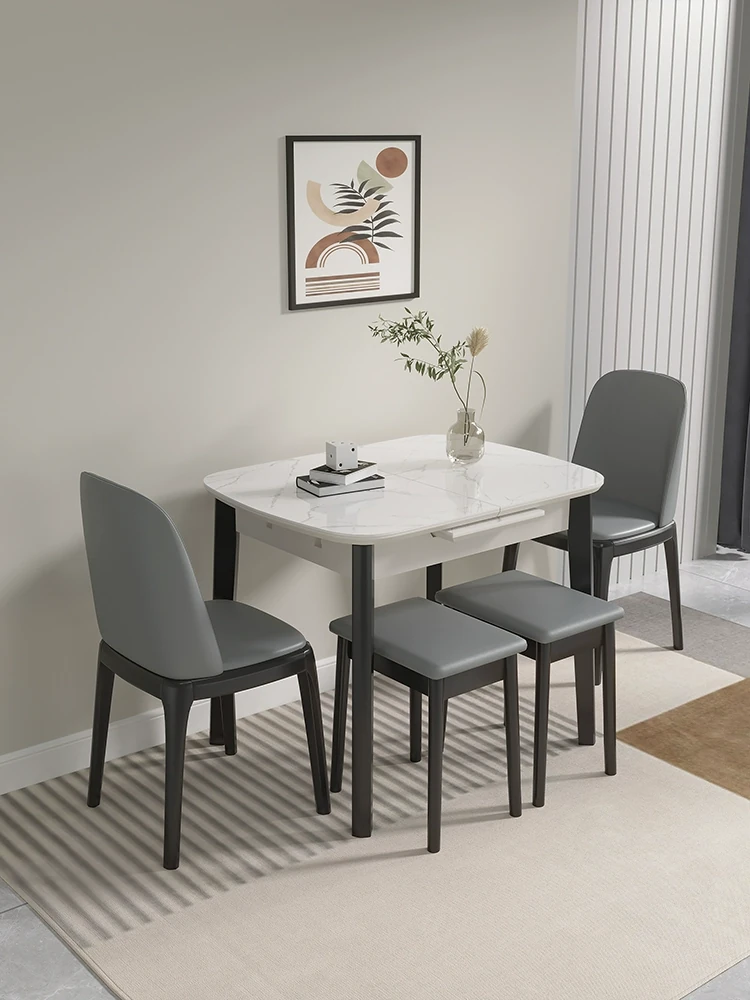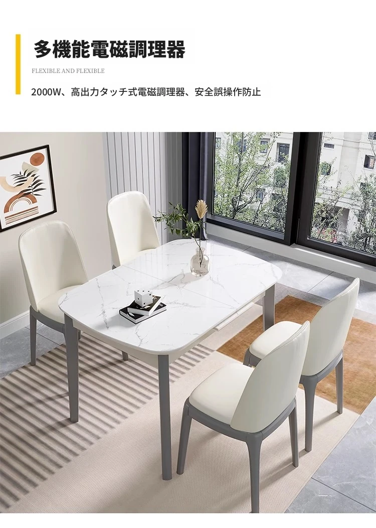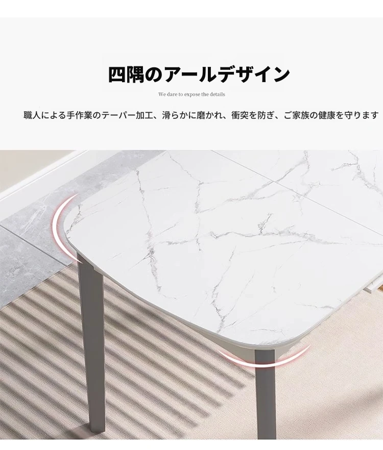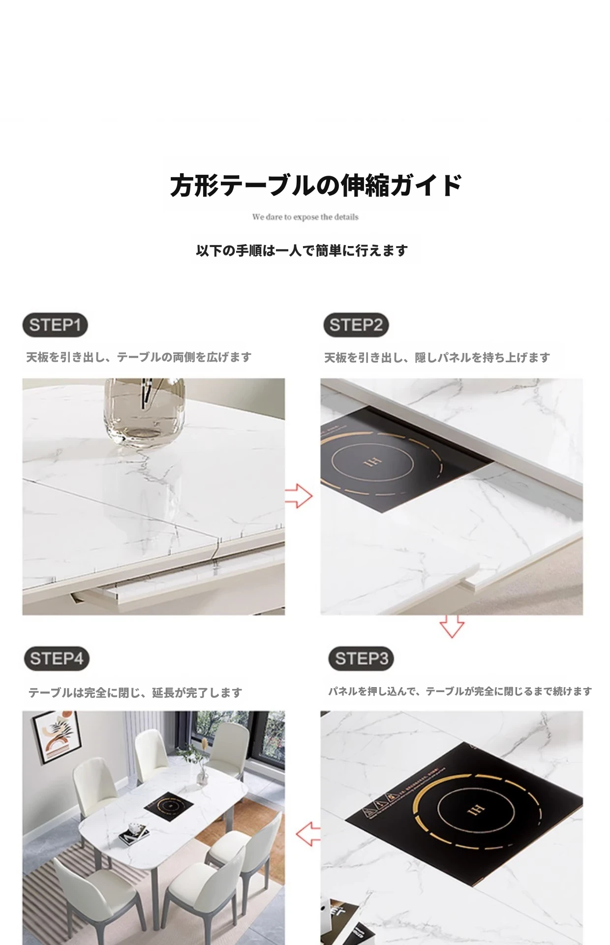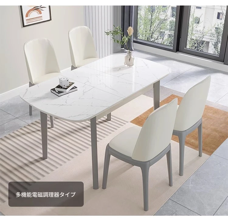 モダンミニマリストデザインのスリムな岩板ダイニングテーブルとチェアセット!多機能で伸縮可能、折りたたみ式の長方形テーブルは、狭いスペースでも使いやすく、家族や友人との楽しい食事に最適です。