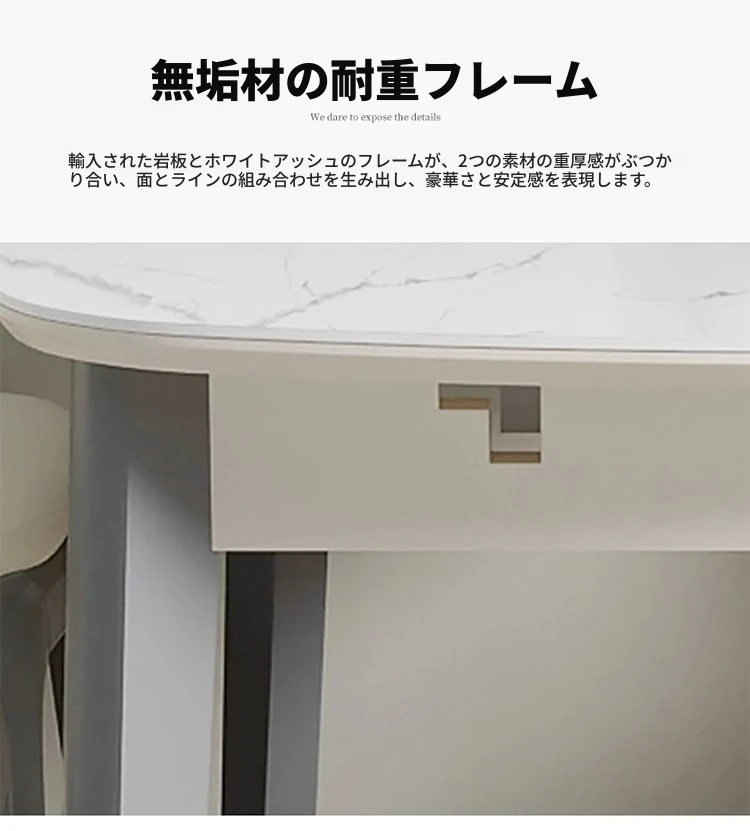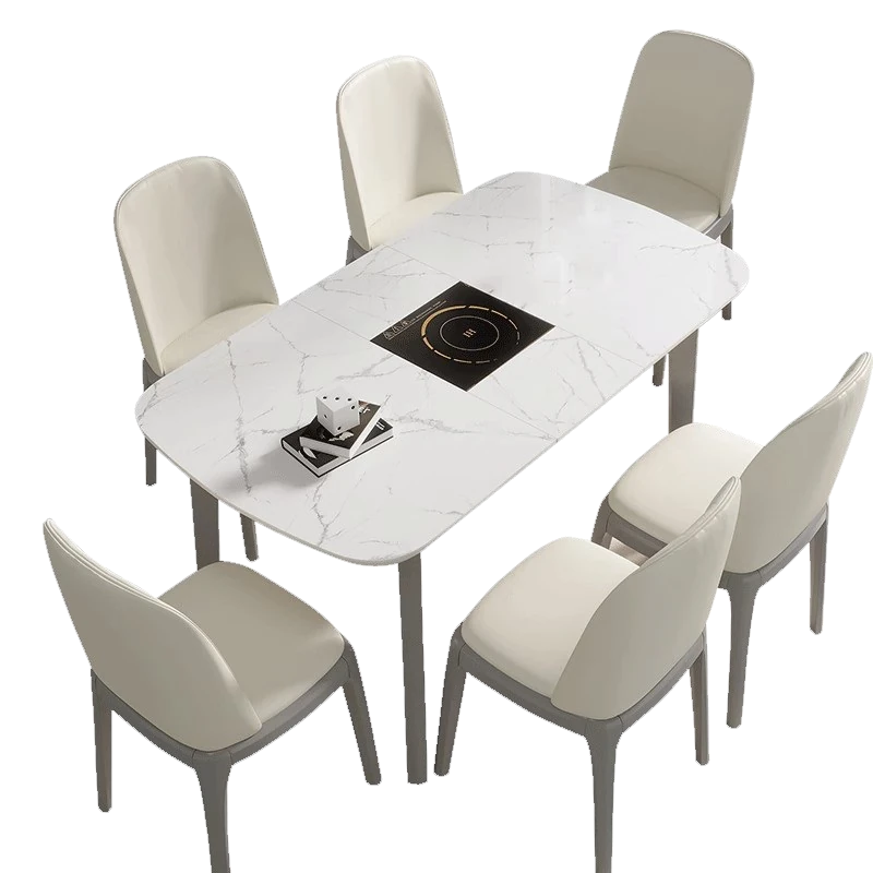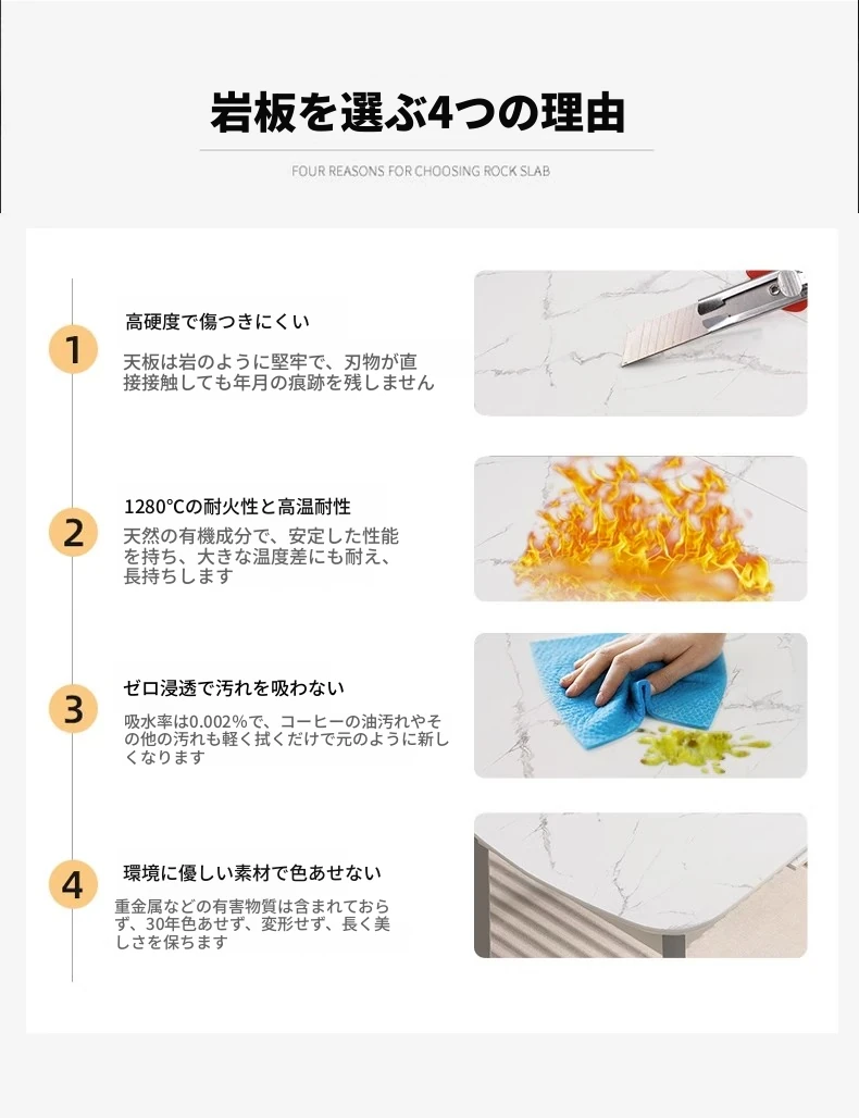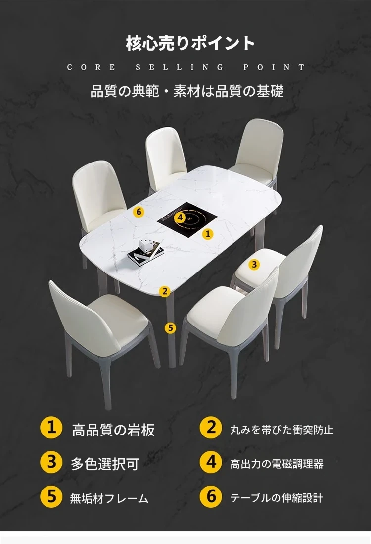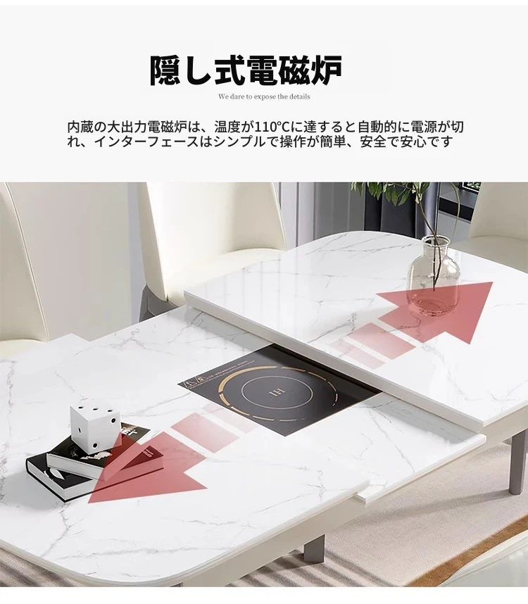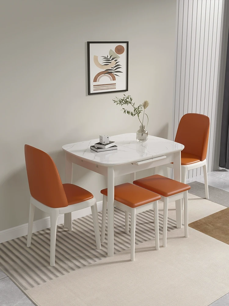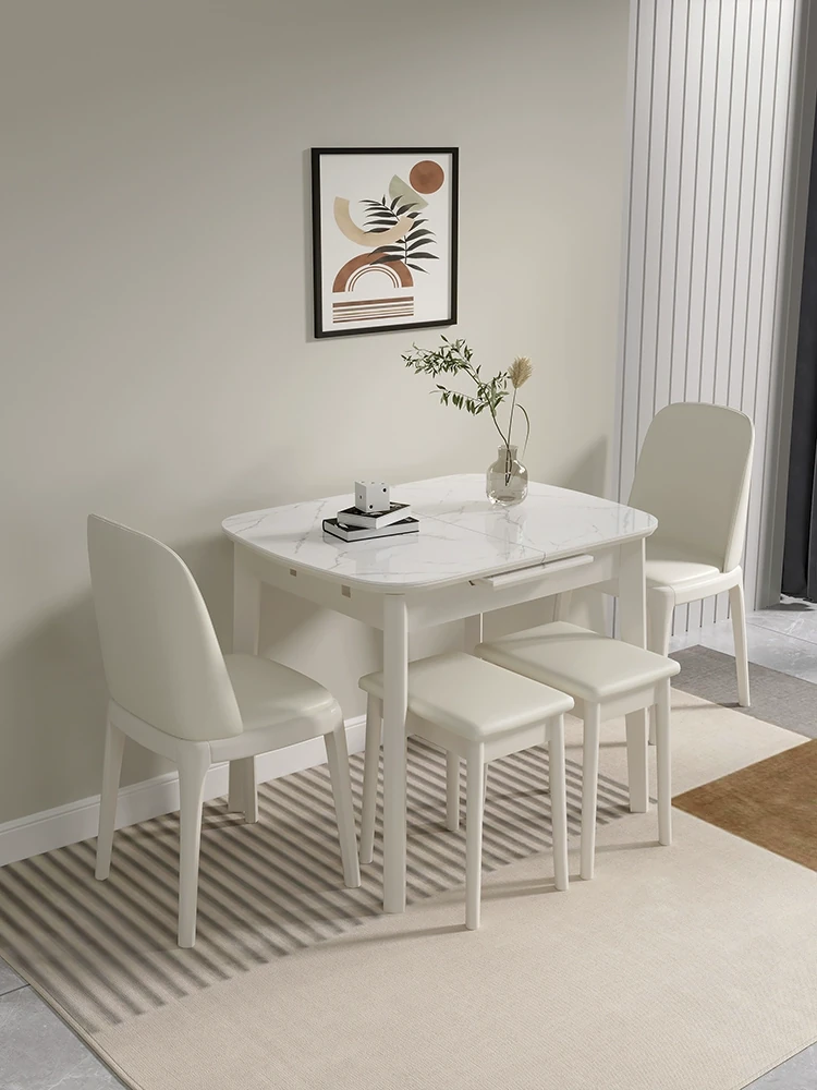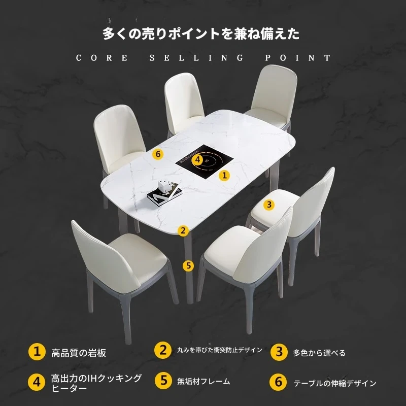 モダンミニマリストデザインのスリムな岩板ダイニングテーブルとチェアセット!多機能で伸縮可能、折りたたみ式の長方形テーブルは、狭いスペースでも使いやすく、家族や友人との楽しい食事に最適です。
