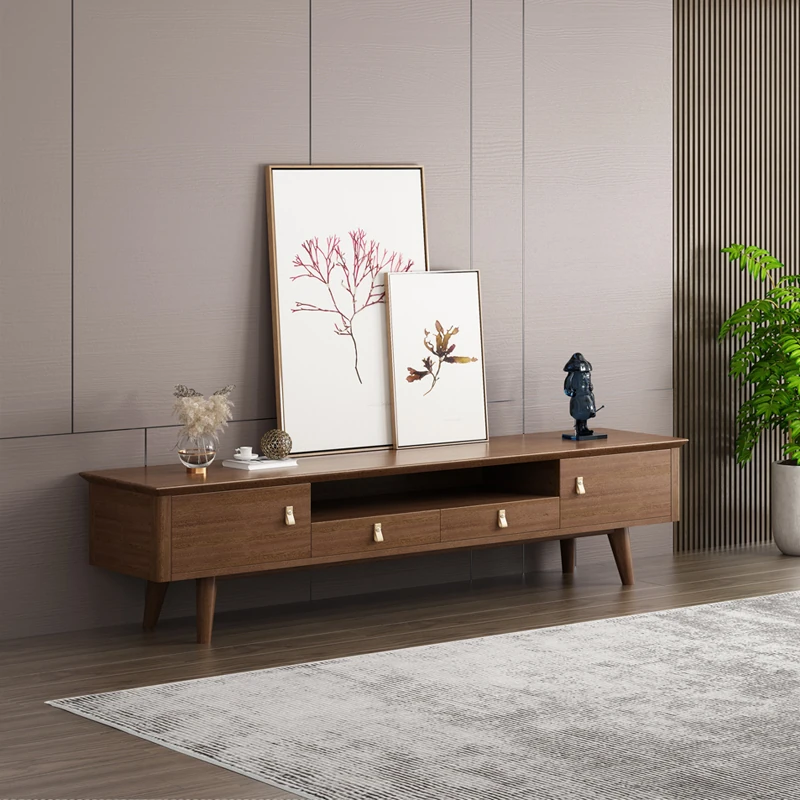現代的なミニマリストデザインの軽奢木製テレビキャビネット - ウォールナット製、コンパクトなリビングルームに最適な収納力を持つシンプルでスタイリッシュな映像キャビネット。