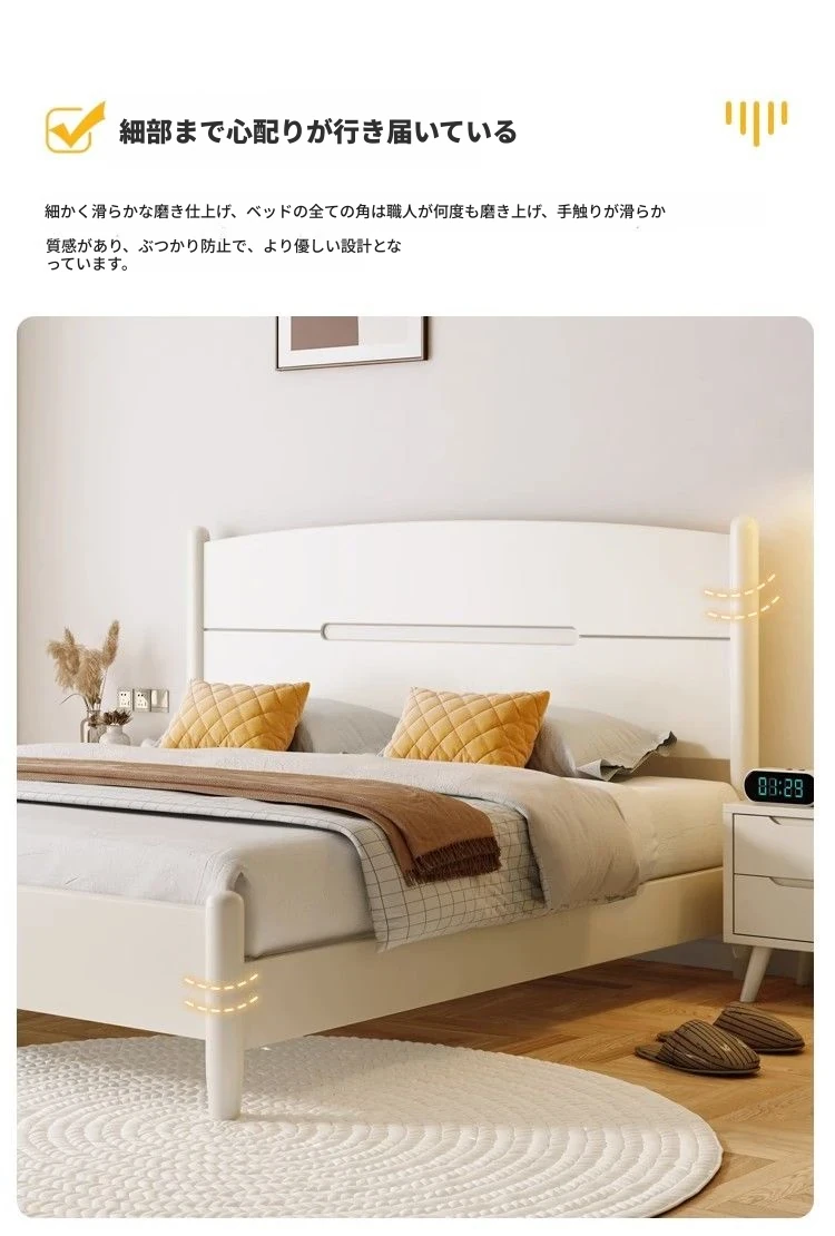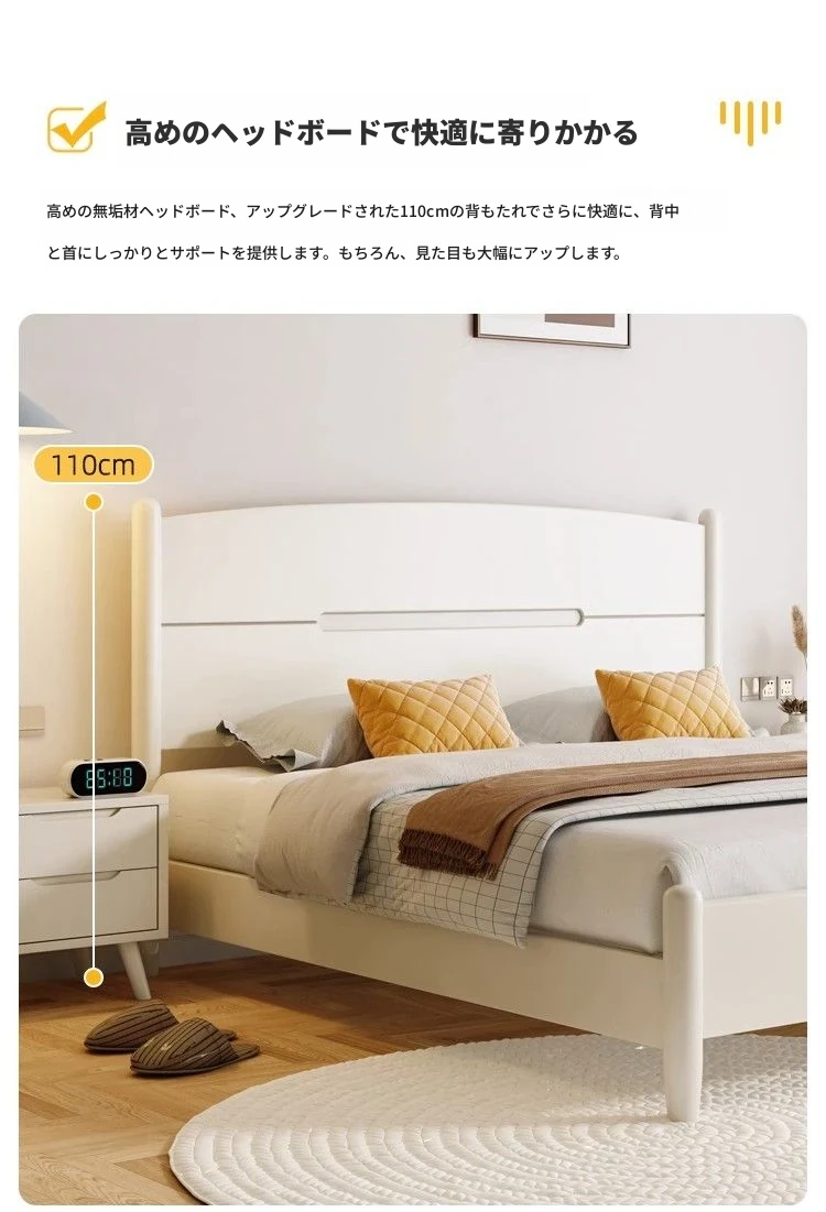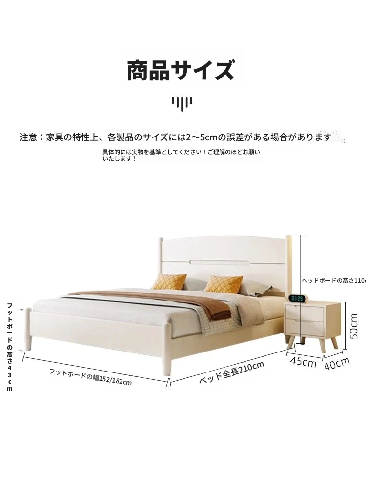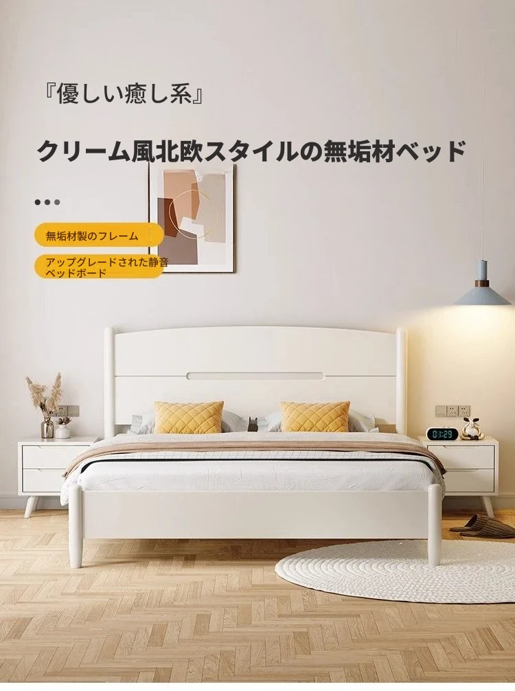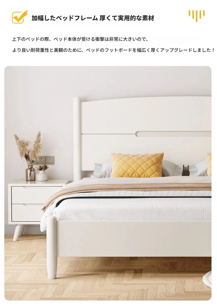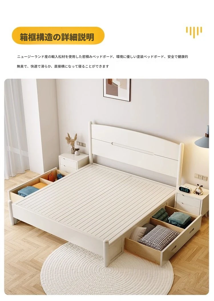 クリームカラーのホワイトウッドベッド|モダンでシンプルなデザイン|1.5m & 1.8mサイズ|北欧スタイル|収納付きの二人用マリッジベッド【快適な眠りをサポートします】