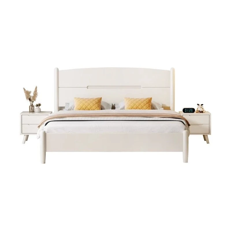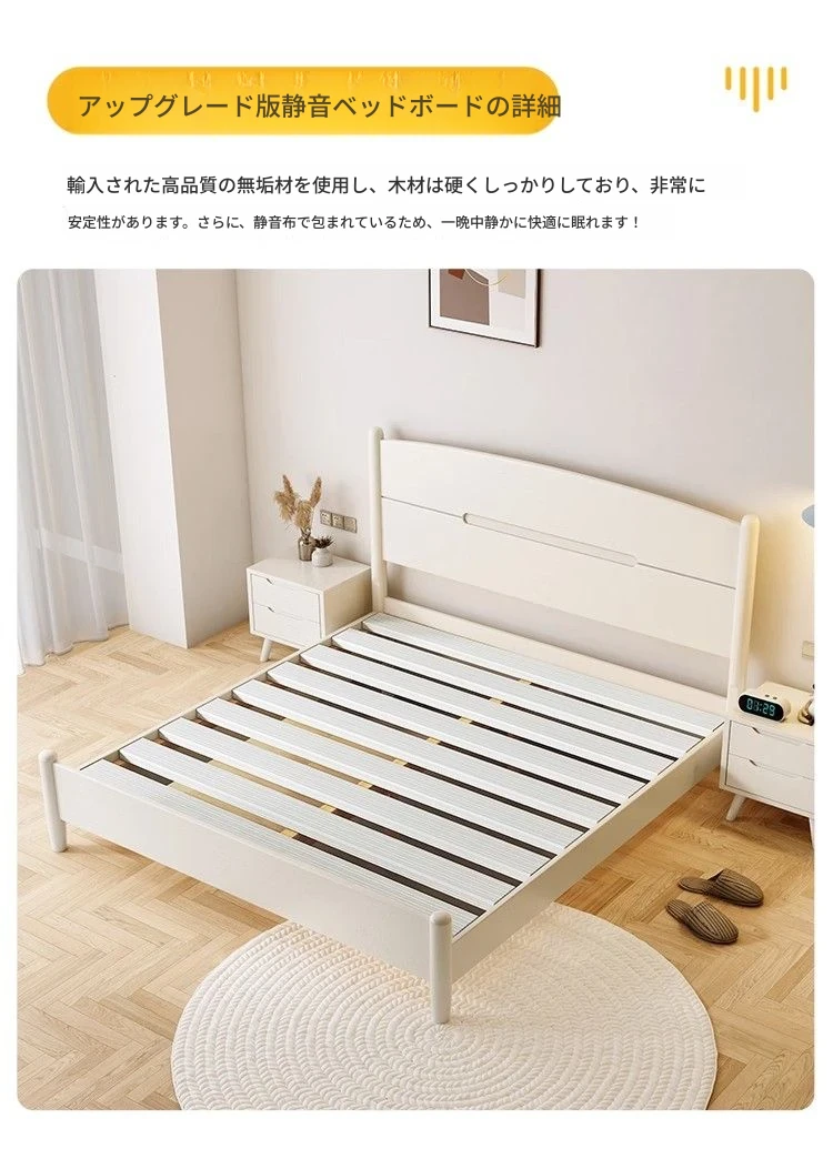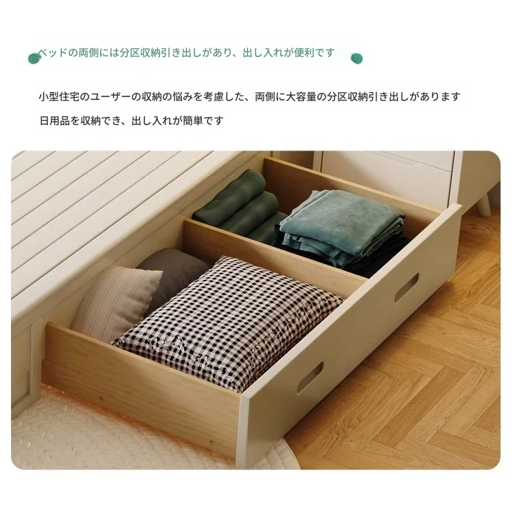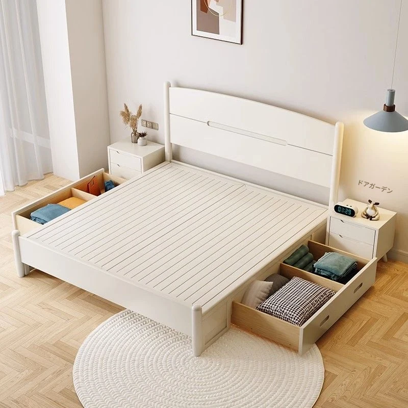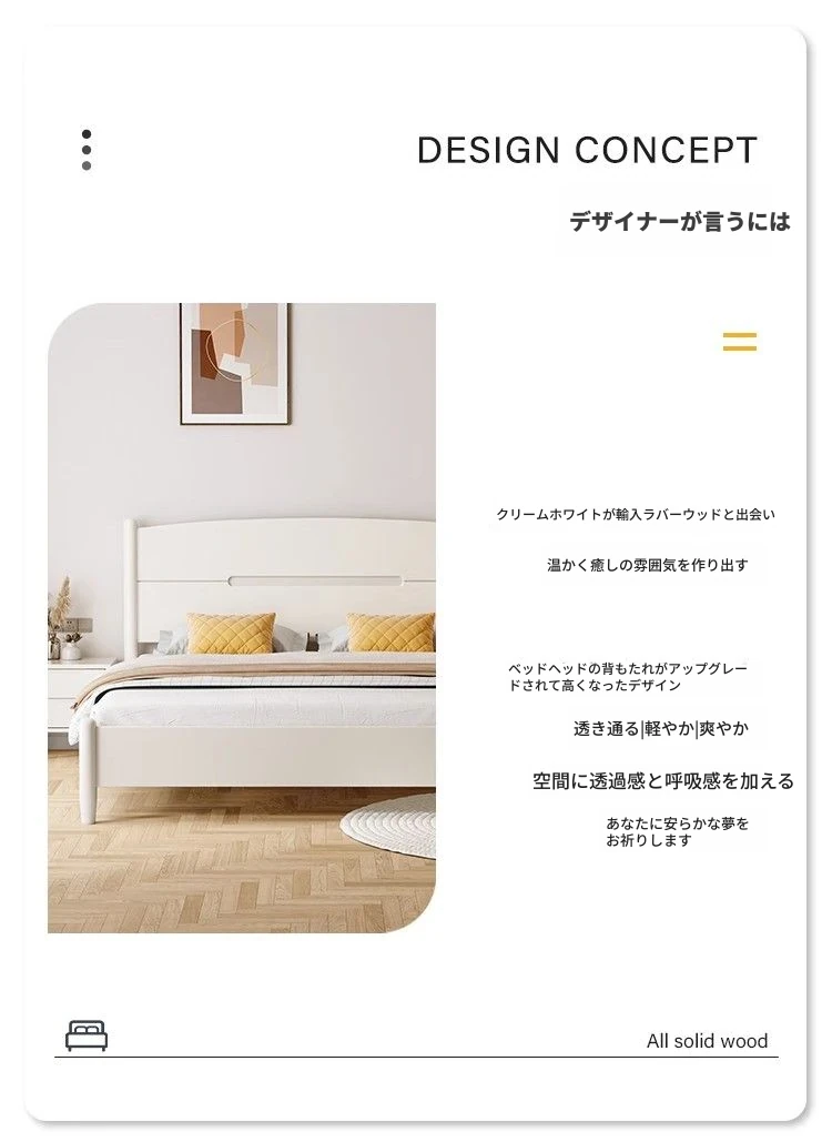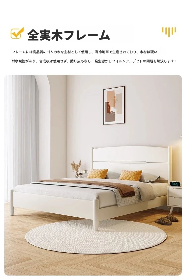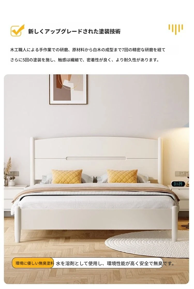 クリームカラーのホワイトウッドベッド|モダンでシンプルなデザイン|1.5m & 1.8mサイズ|北欧スタイル|収納付きの二人用マリッジベッド【快適な眠りをサポートします】
