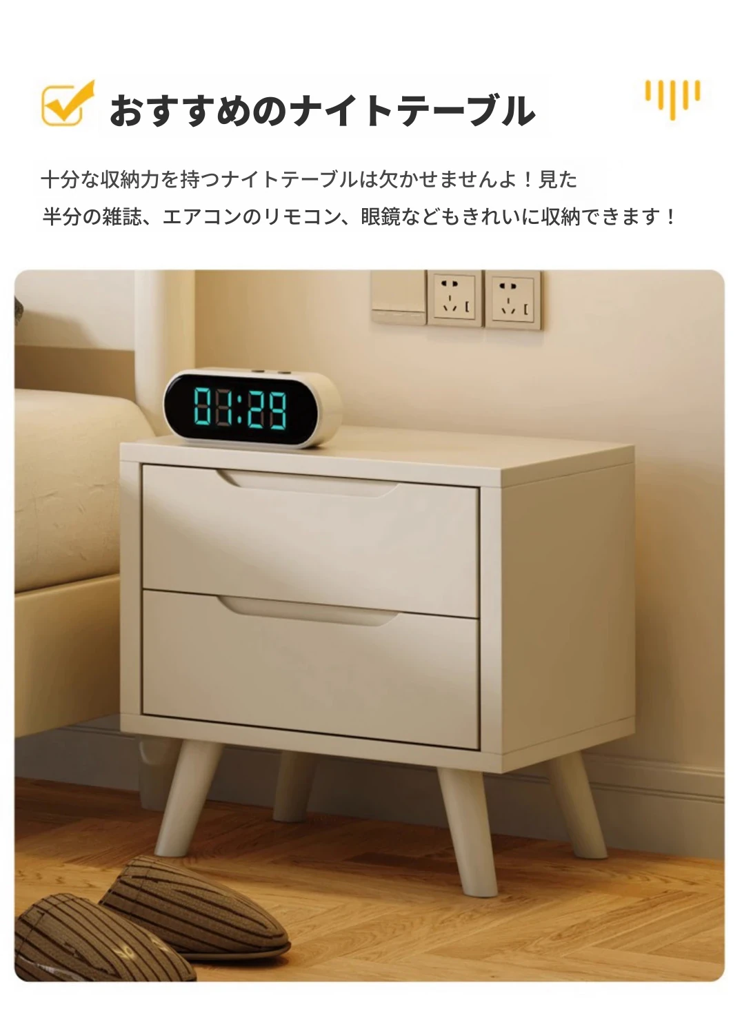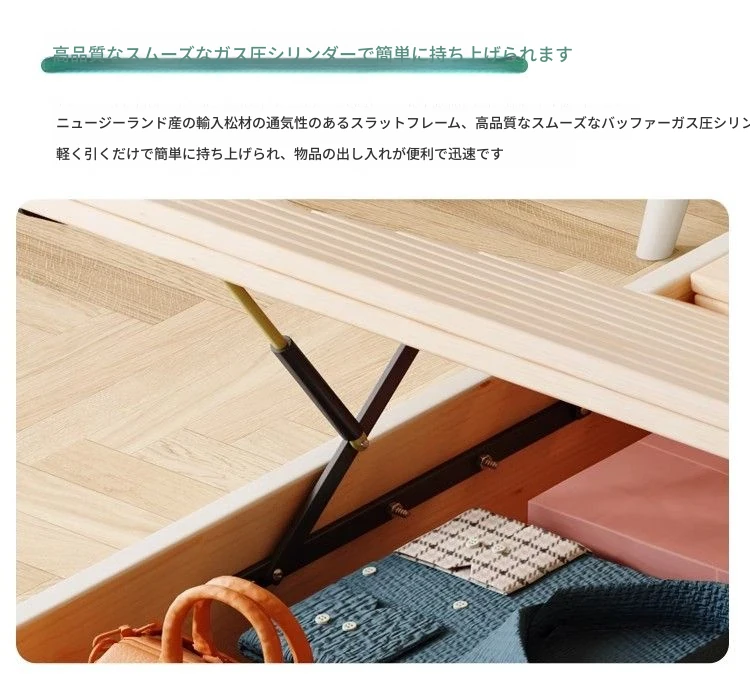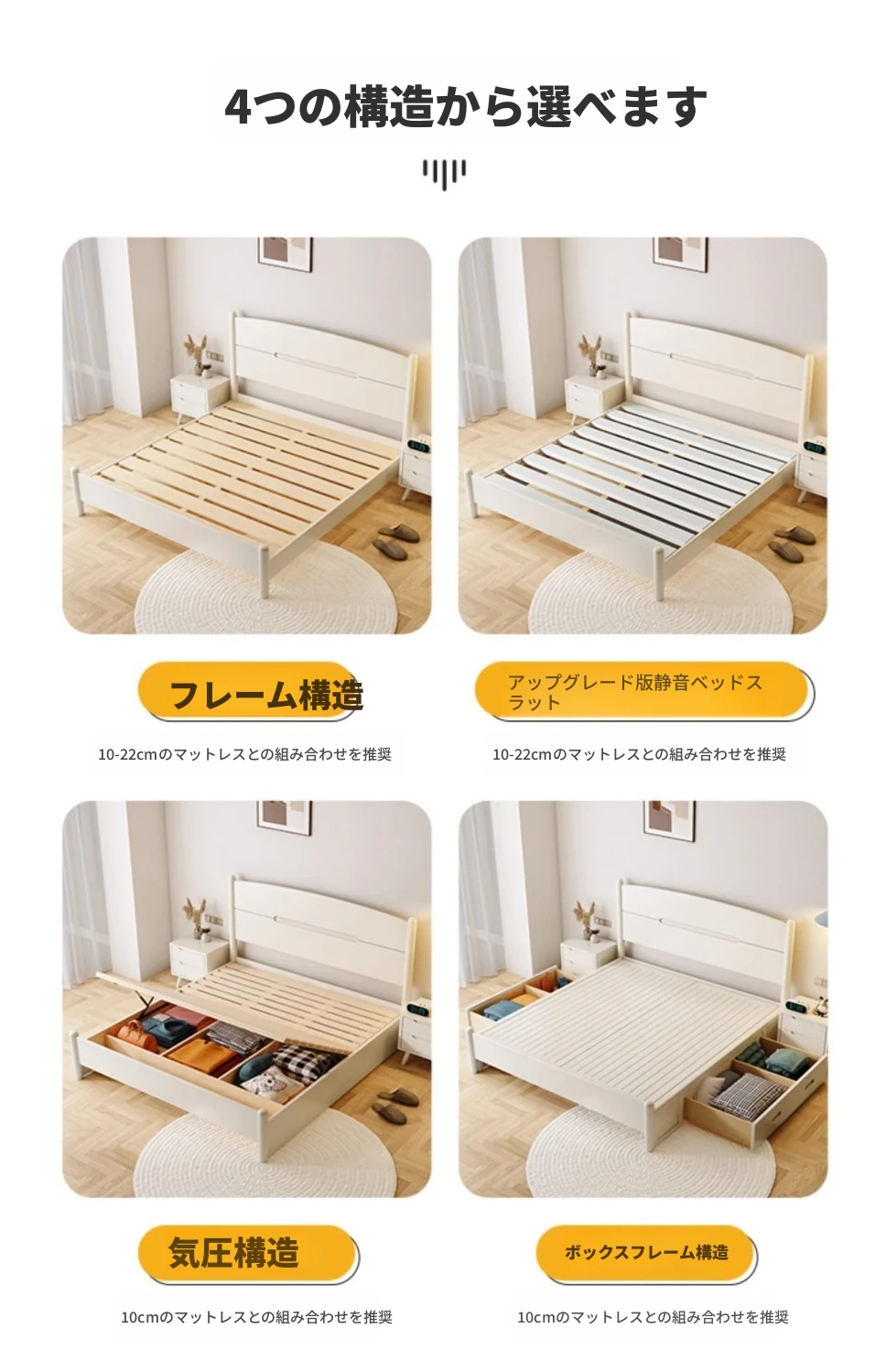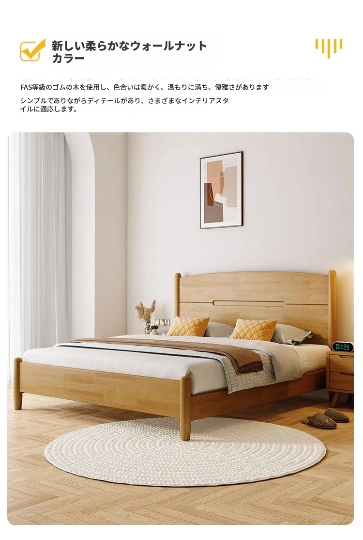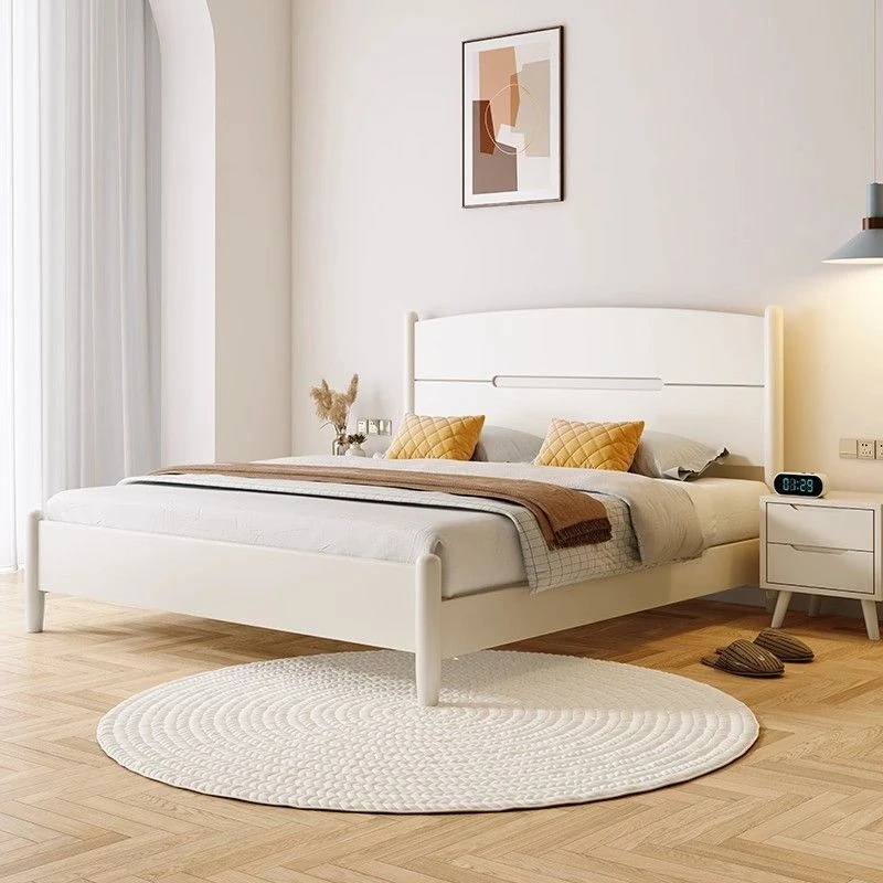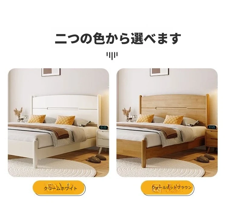 クリームカラーのホワイトウッドベッド|モダンでシンプルなデザイン|1.5m & 1.8mサイズ|北欧スタイル|収納付きの二人用マリッジベッド【快適な眠りをサポートします】
