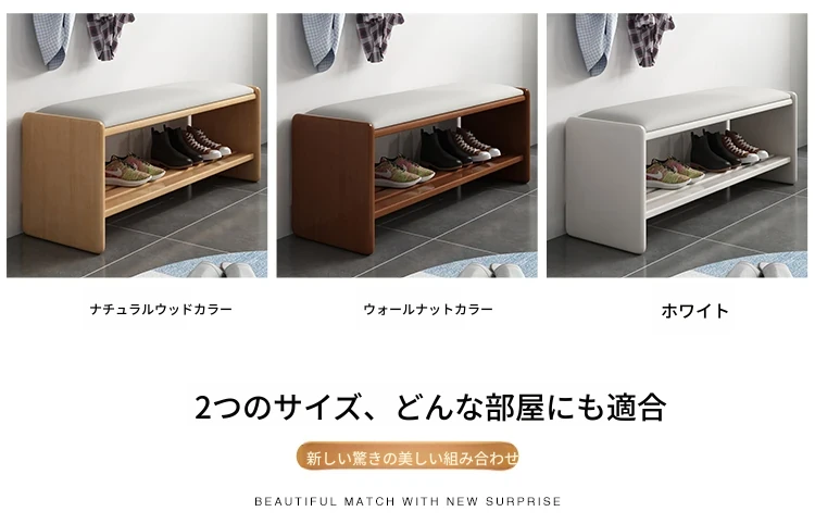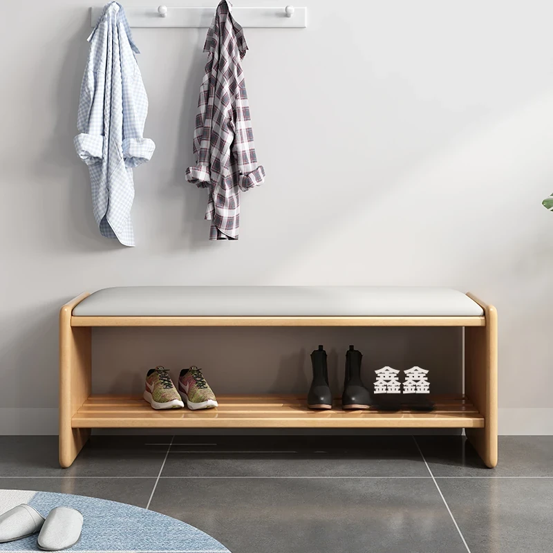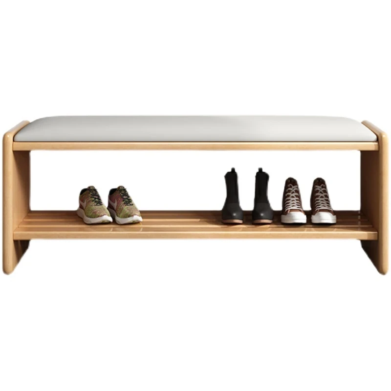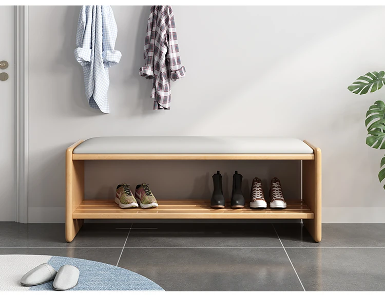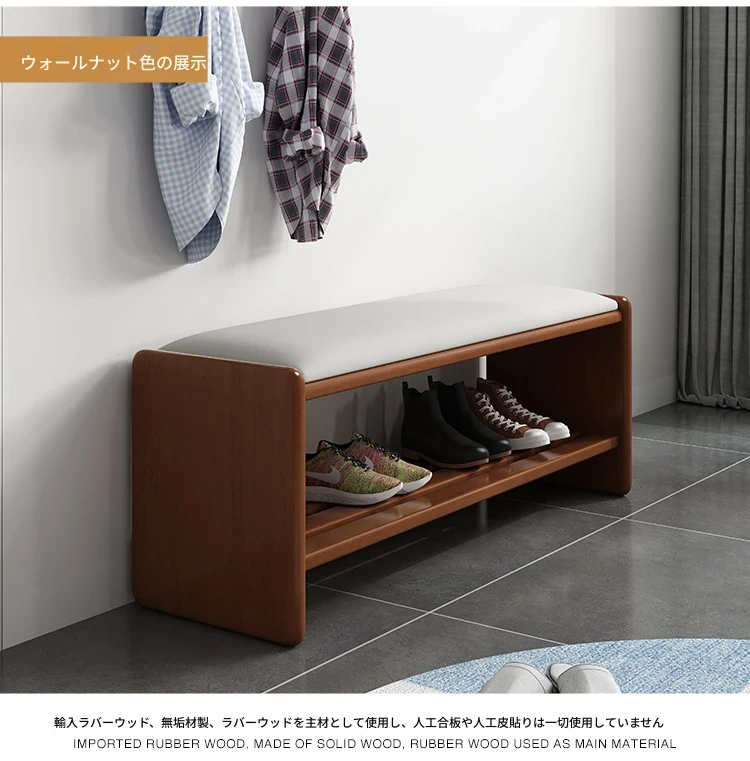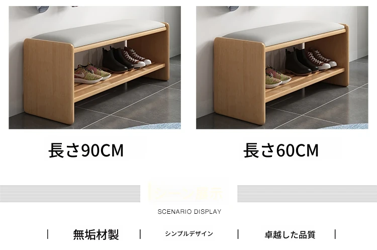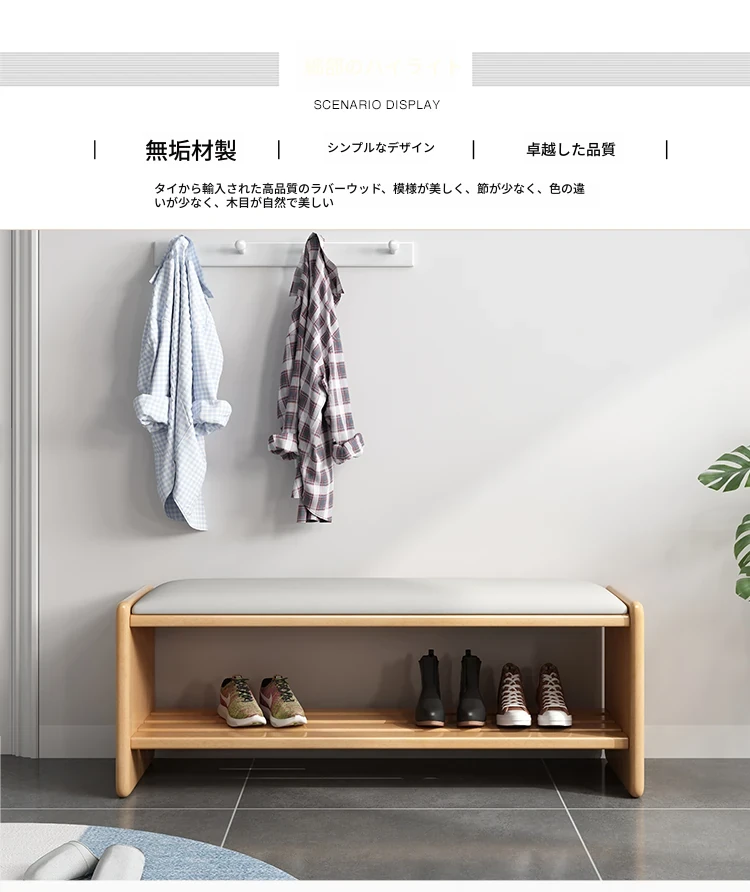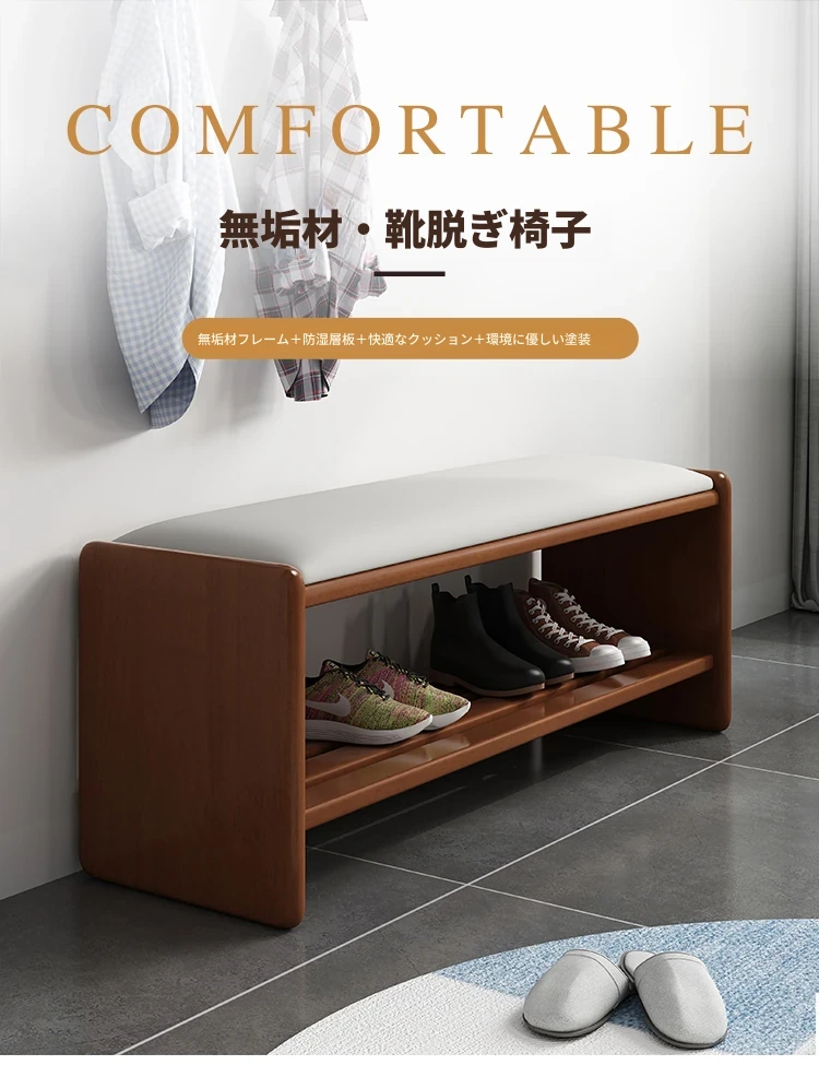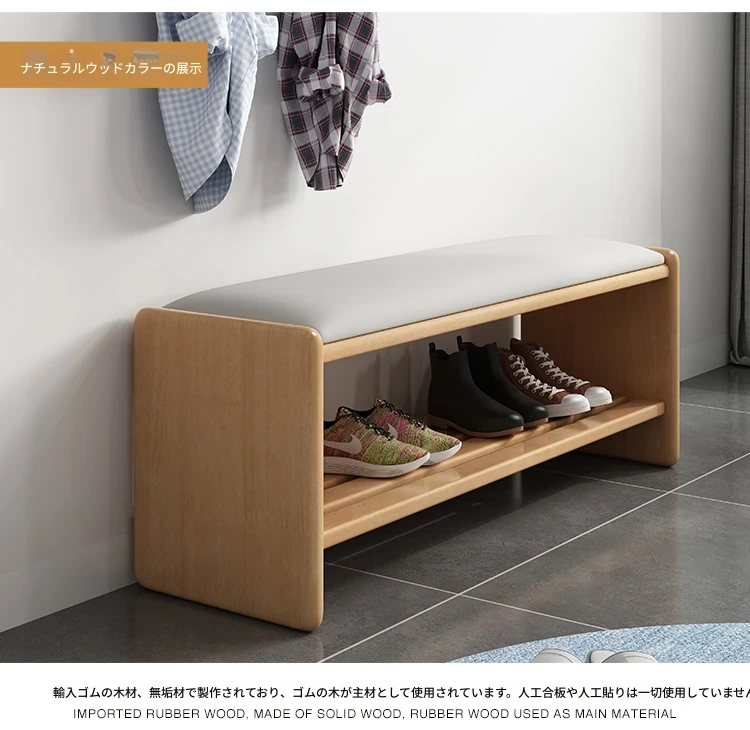 北欧スタイルの天然木製シューズベンチ - おしゃれなソフトパッド付き、玄関にぴったり!収納機能付きで靴の整理も簡単。快適な座り心地で、毎日の靴の出し入れが楽しくなる!